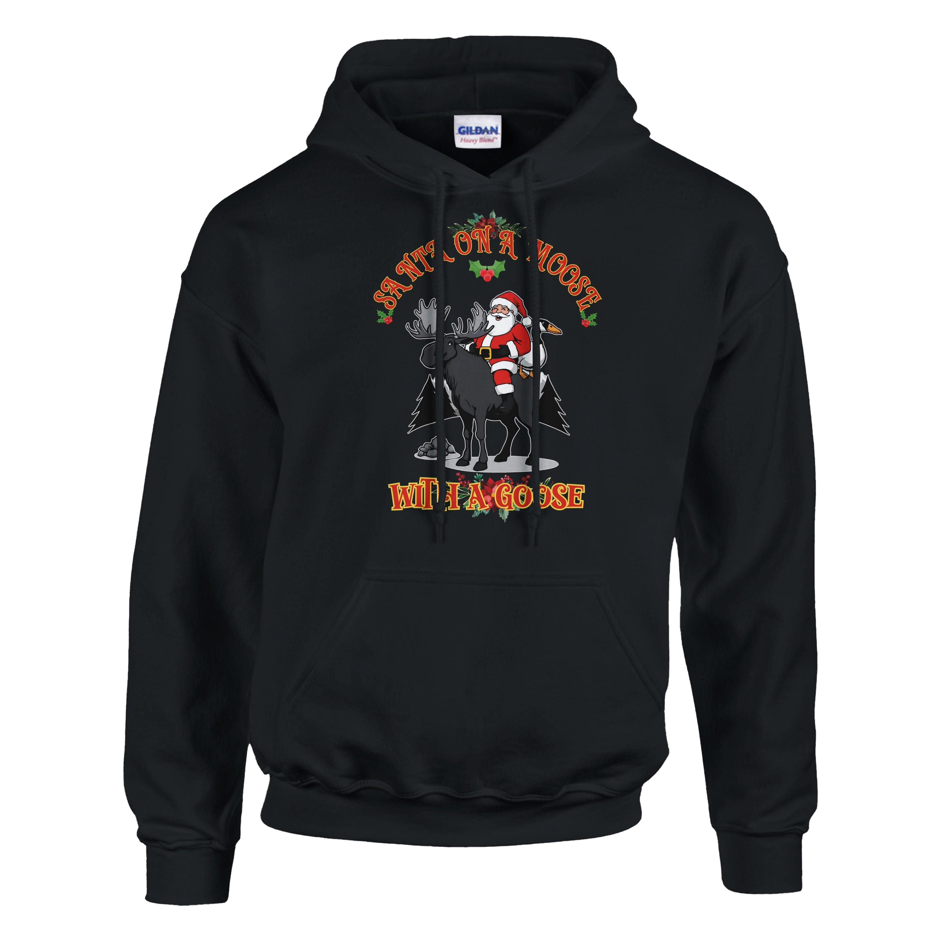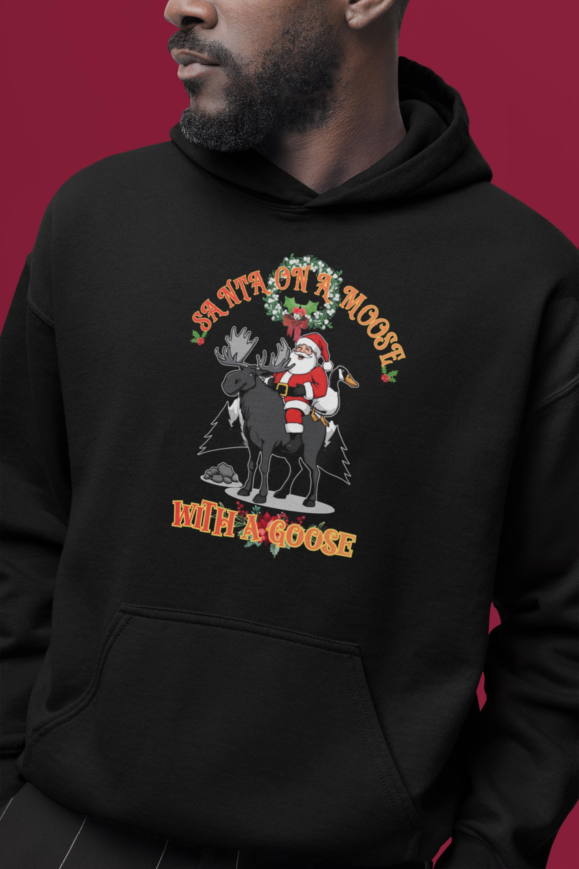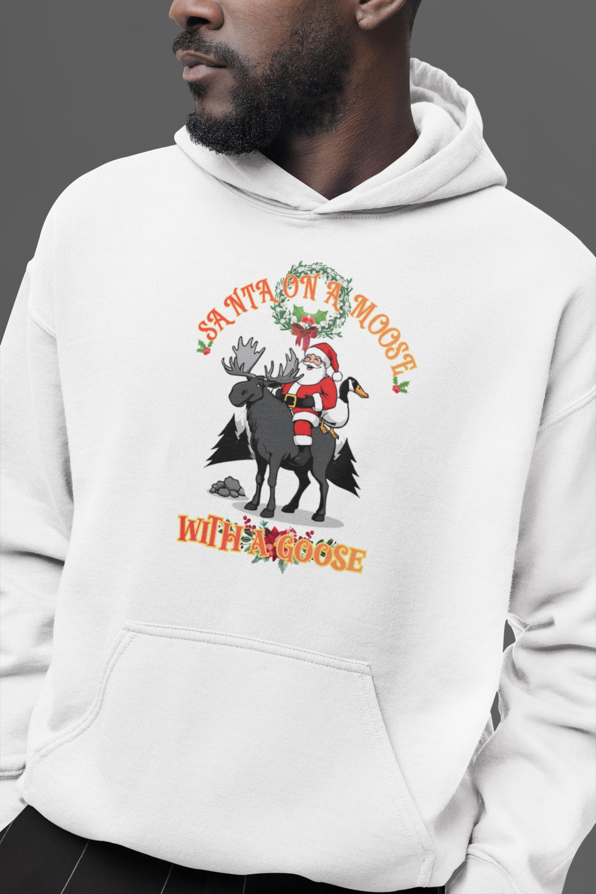 Get ready to steal the spotlight at every holiday gathering with this hilariously unique design featuring Santa riding a moose… accompanied by a goose! It’s playful, quirky, and just the right amount of festive chaos.