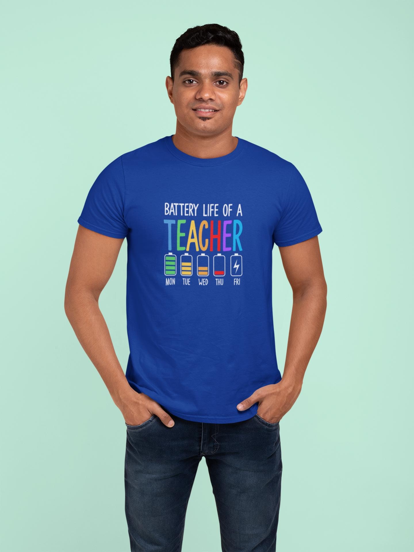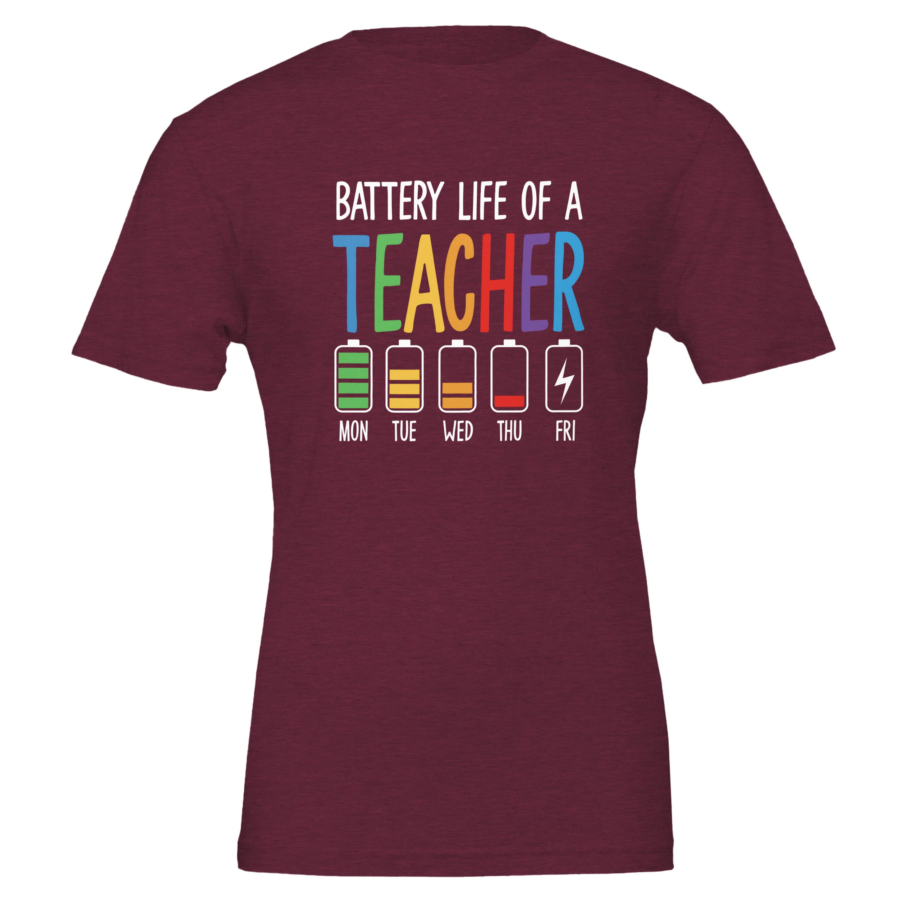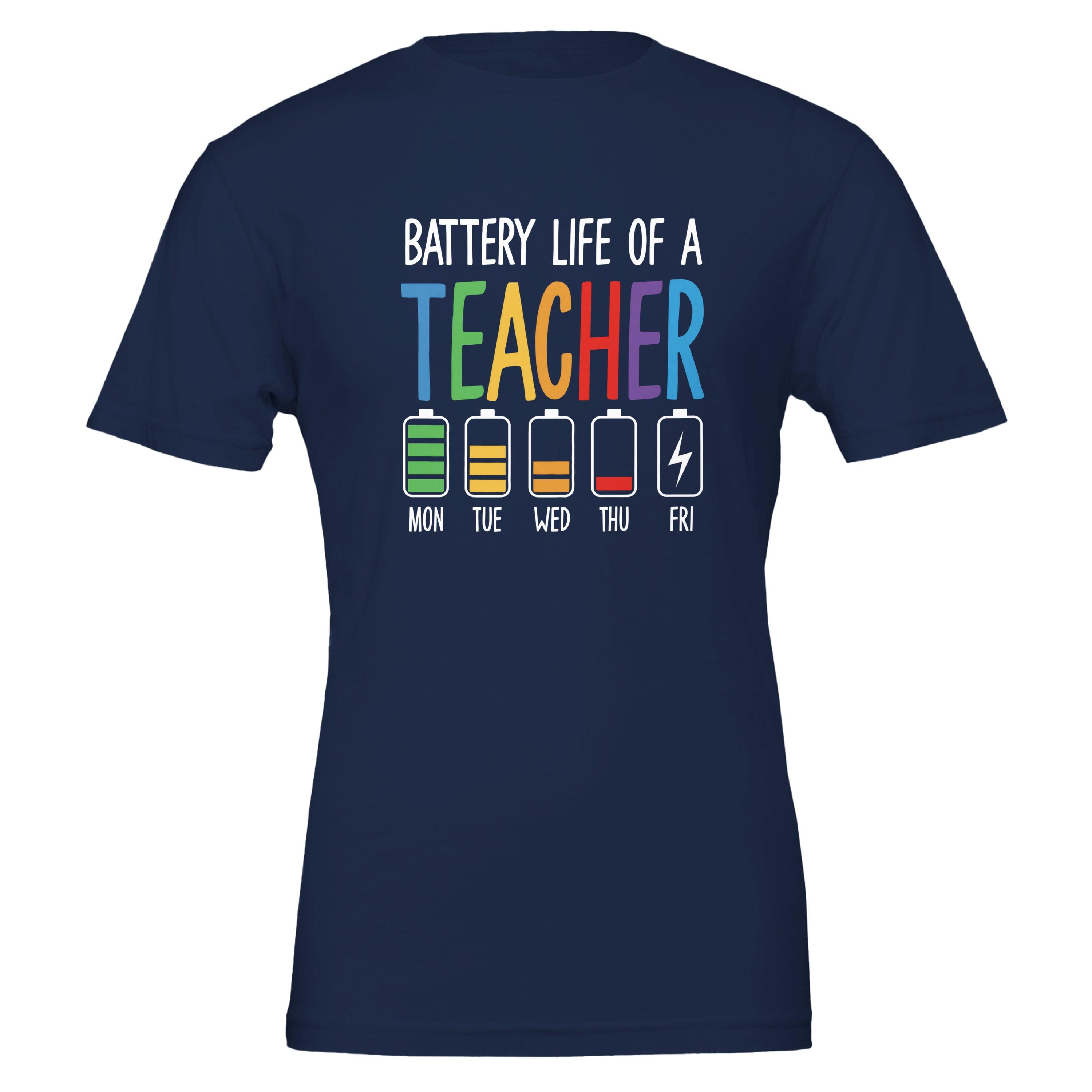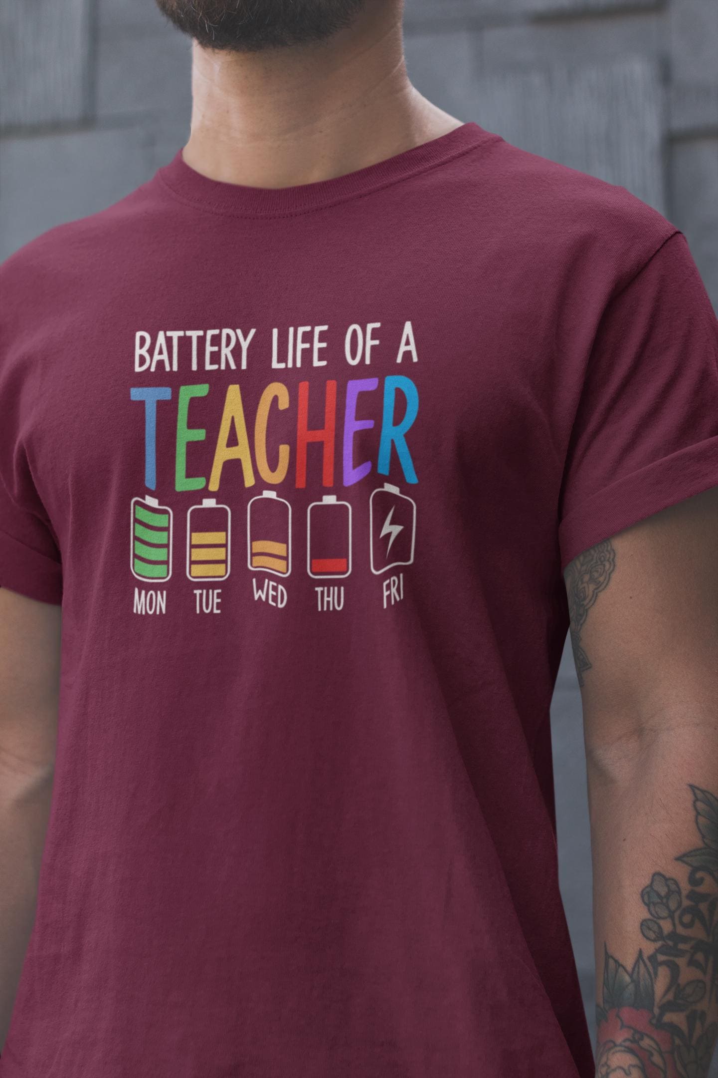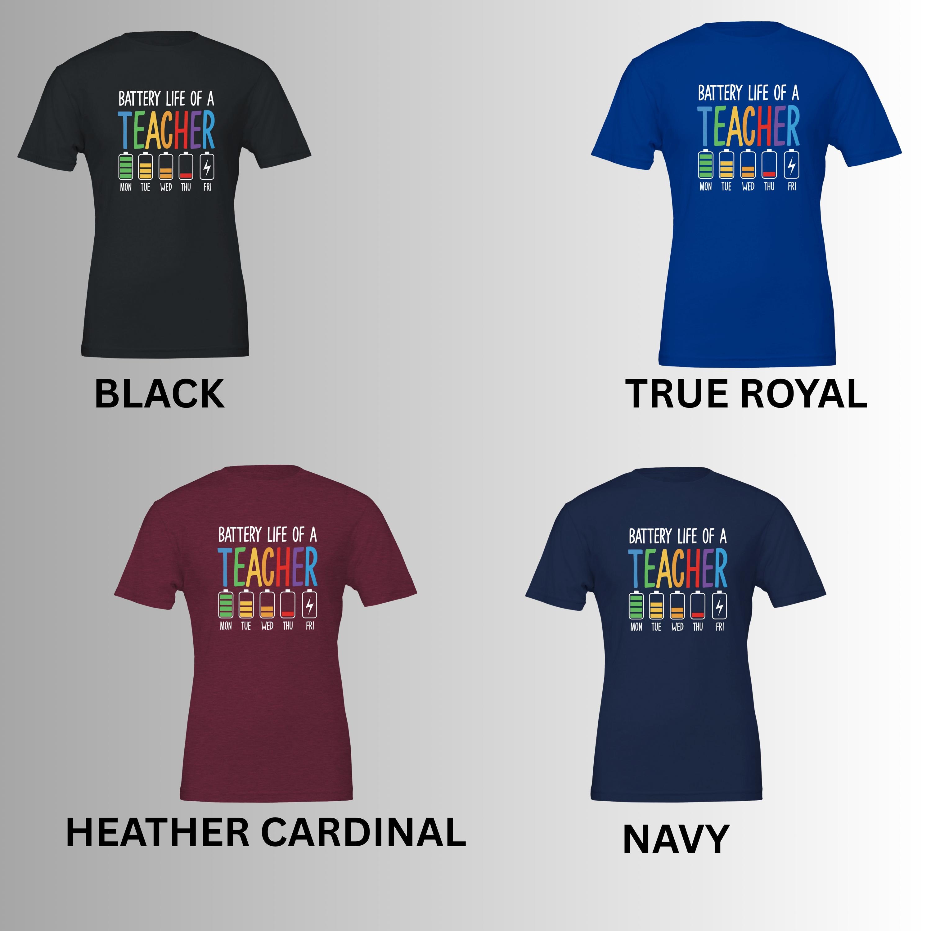 www.etsy.com/shop/YukaDupCelebrate the unforgettable journey of teaching with our 'Battery Life of a Teacher' T-shirt! Perfect for educators, this fun and light-hearted t-shirt makes an ideal gift for teachers, friends, or anyone who appreciates the hard work that goes into shaping future generations. Crafted with love and attention to detail, our t-shirt boasts a soft feel and sturdy construction, specifically designed for DTG printing. You'll