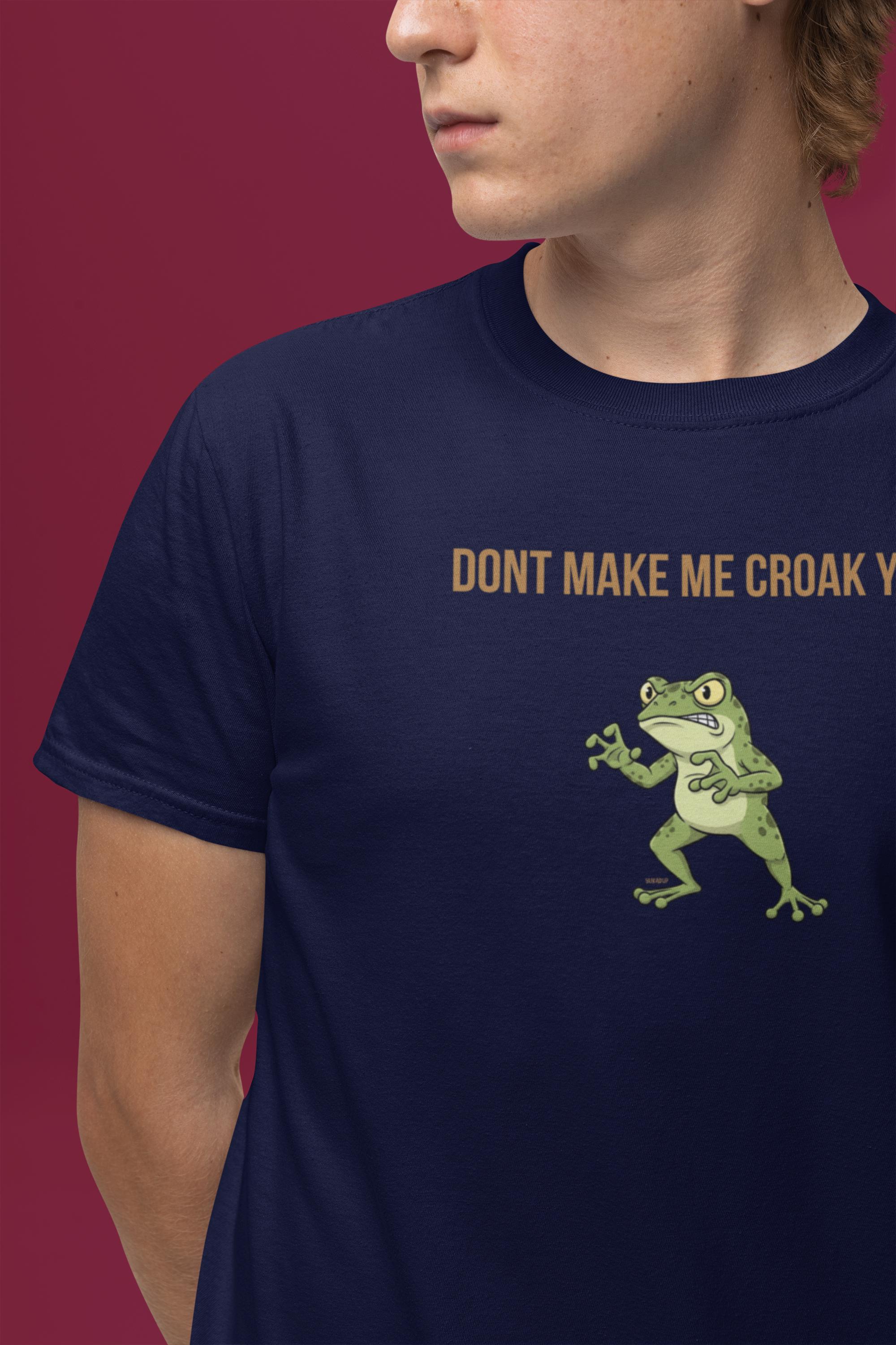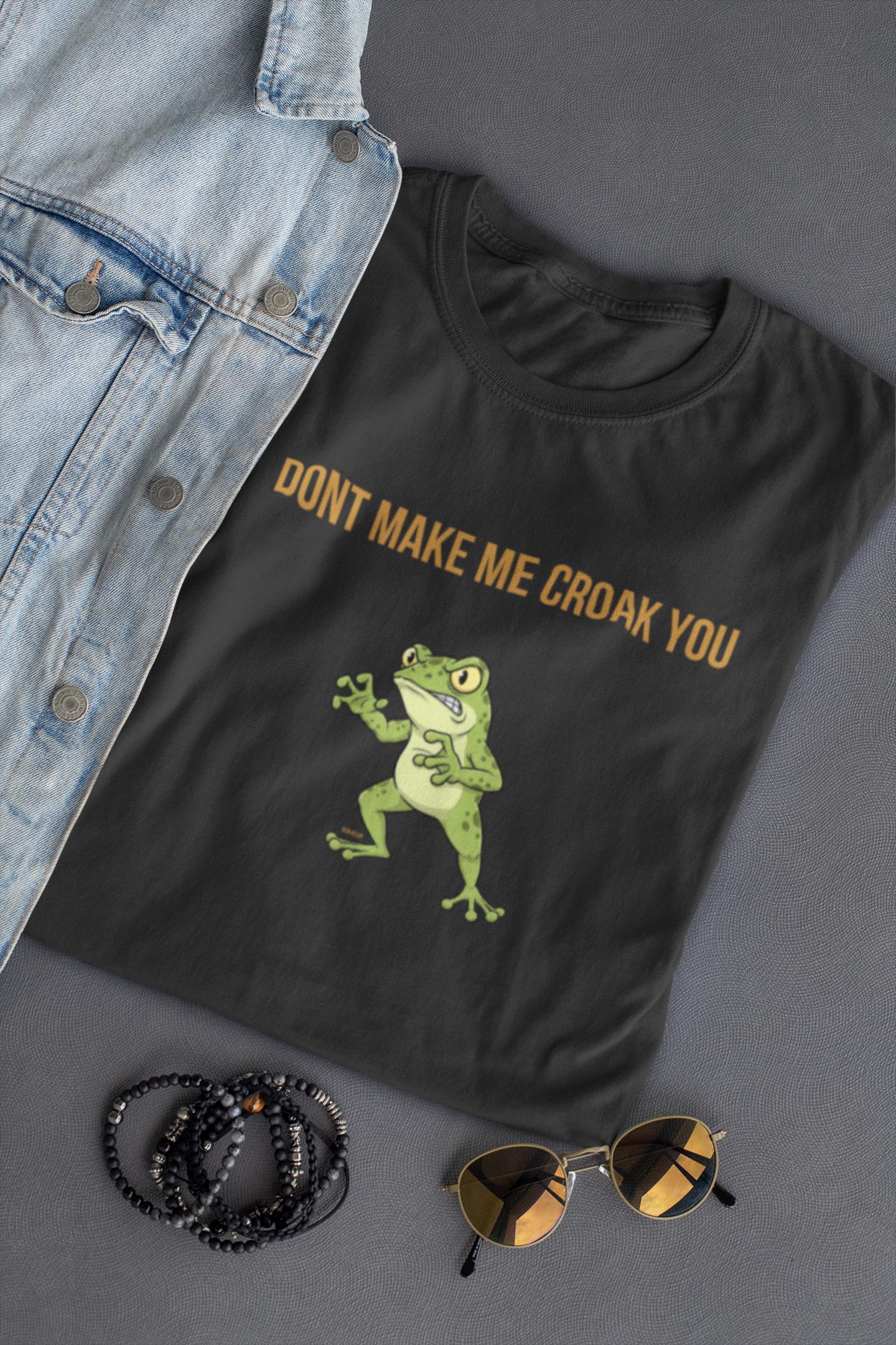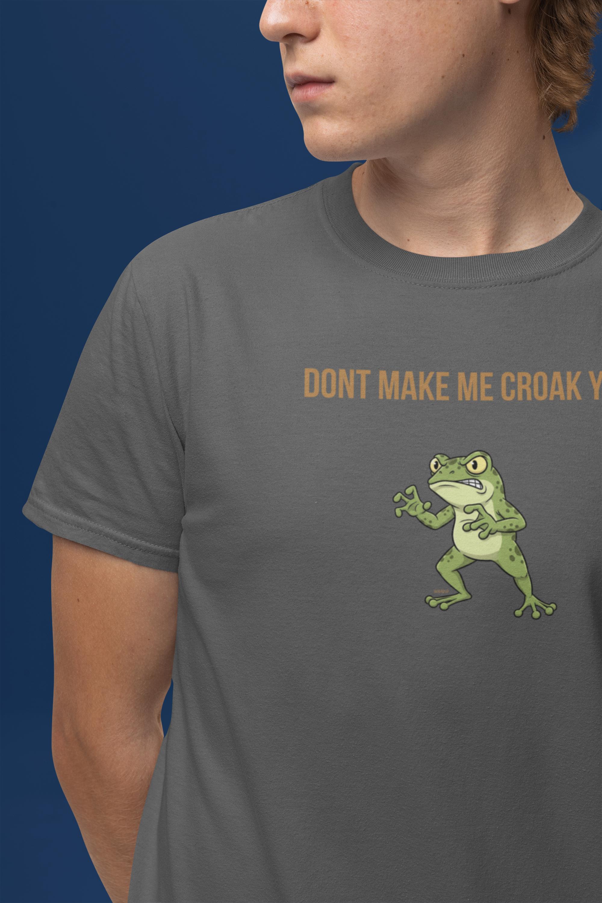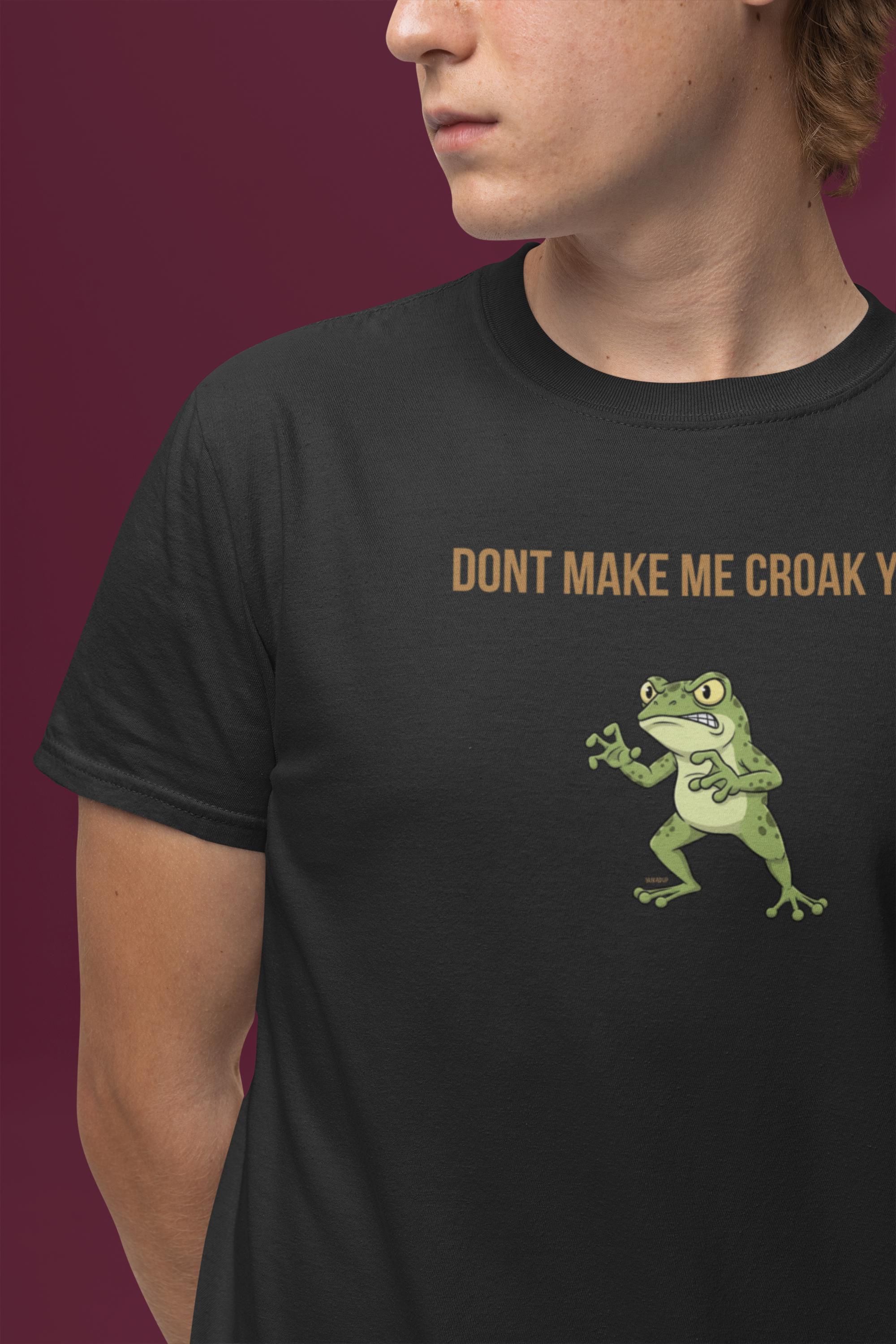 Introducing the "DON'T MAKE ME CROAK YOU" T-shirt, featuring a hilariously menacing amphibian giving a masterclass in silent intimidation. Our stern-faced frog is looking ready to settle things the hard way (with a pair of webbed hands firmly around a neck).