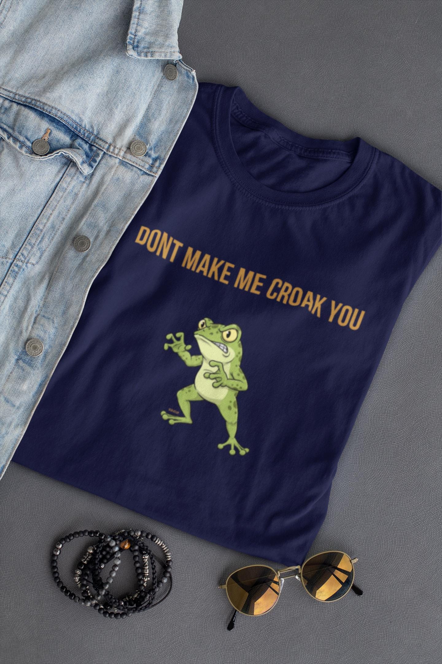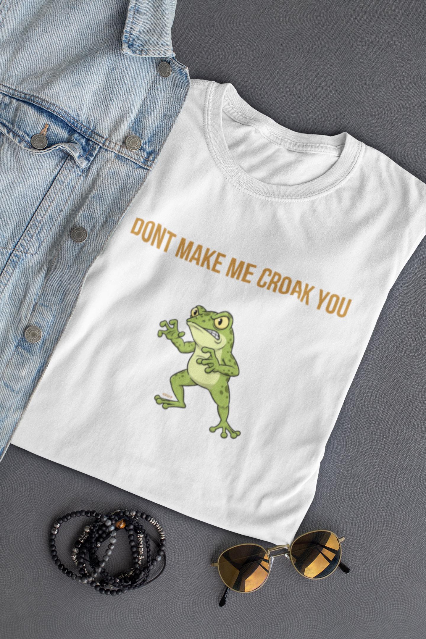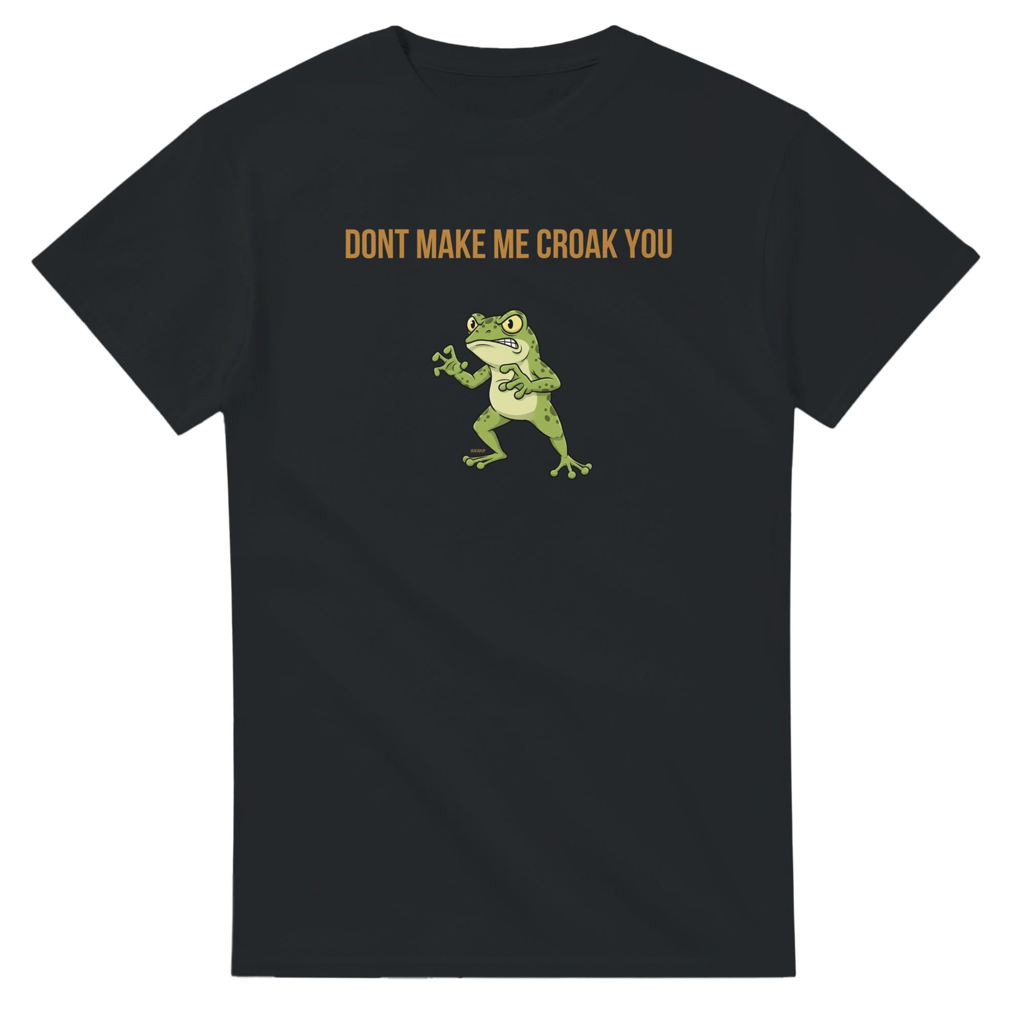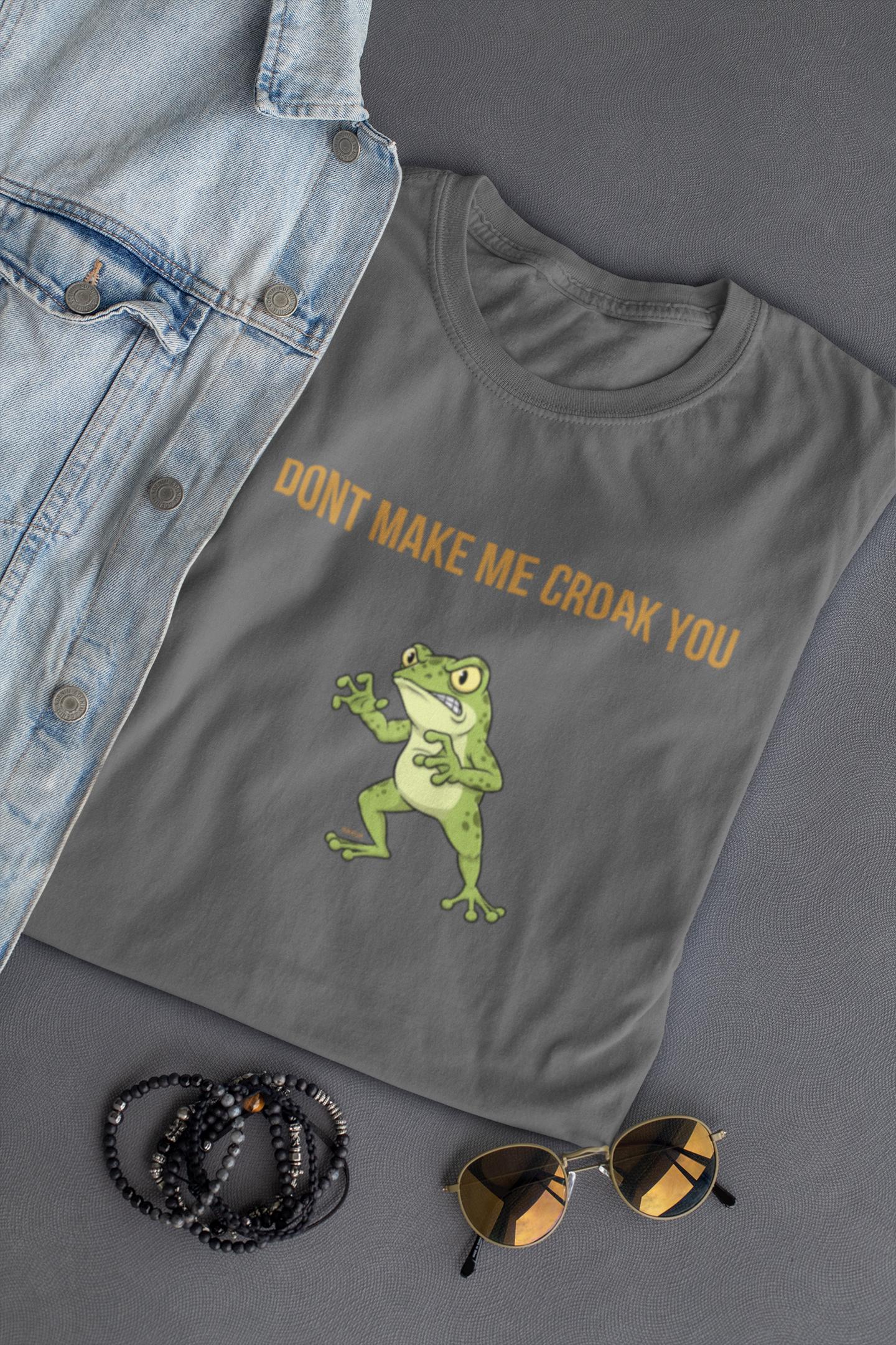 Introducing the "DON'T MAKE ME CROAK YOU" T-shirt, featuring a hilariously menacing amphibian giving a masterclass in silent intimidation. Our stern-faced frog is looking ready to settle things the hard way (with a pair of webbed hands firmly around a neck).
