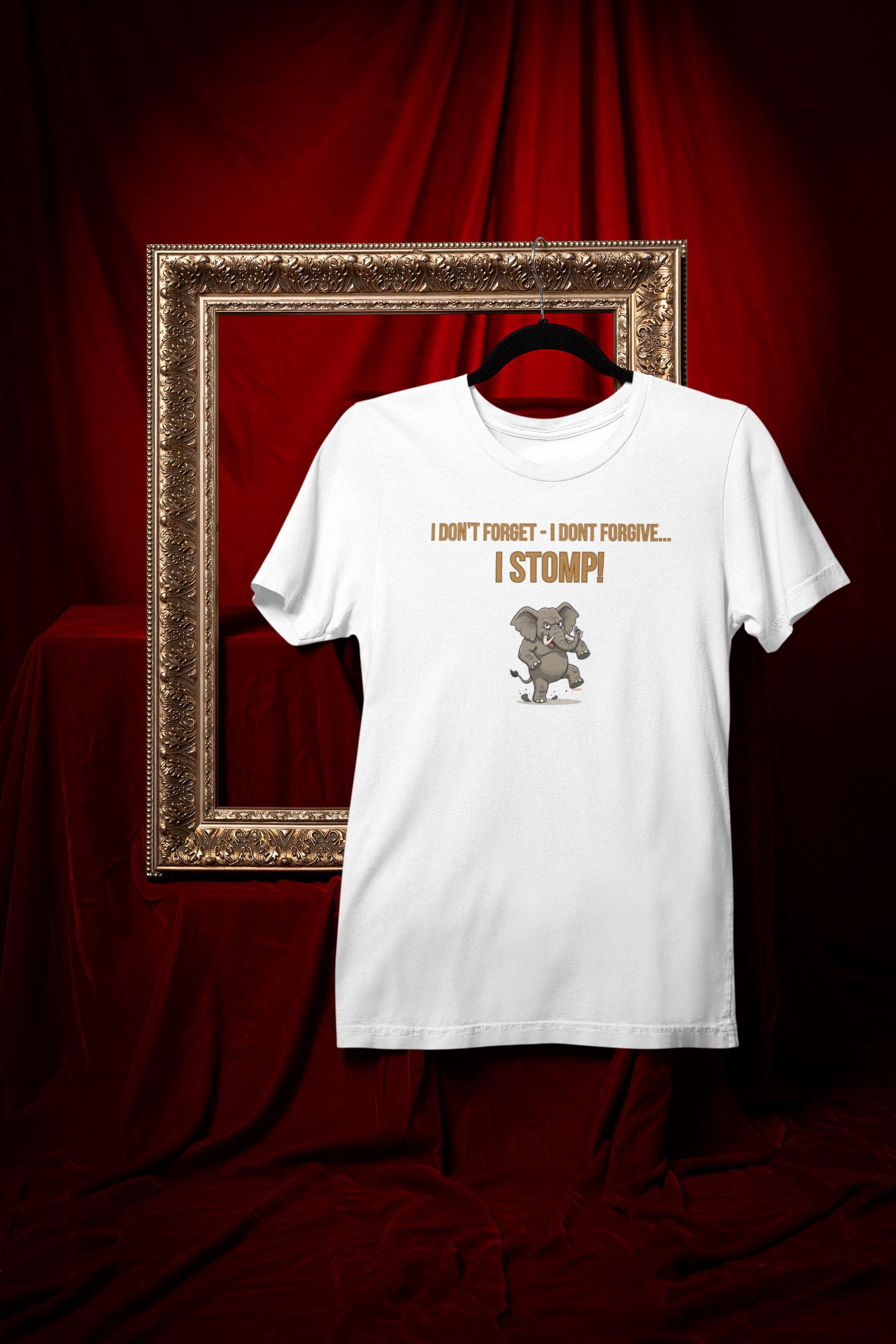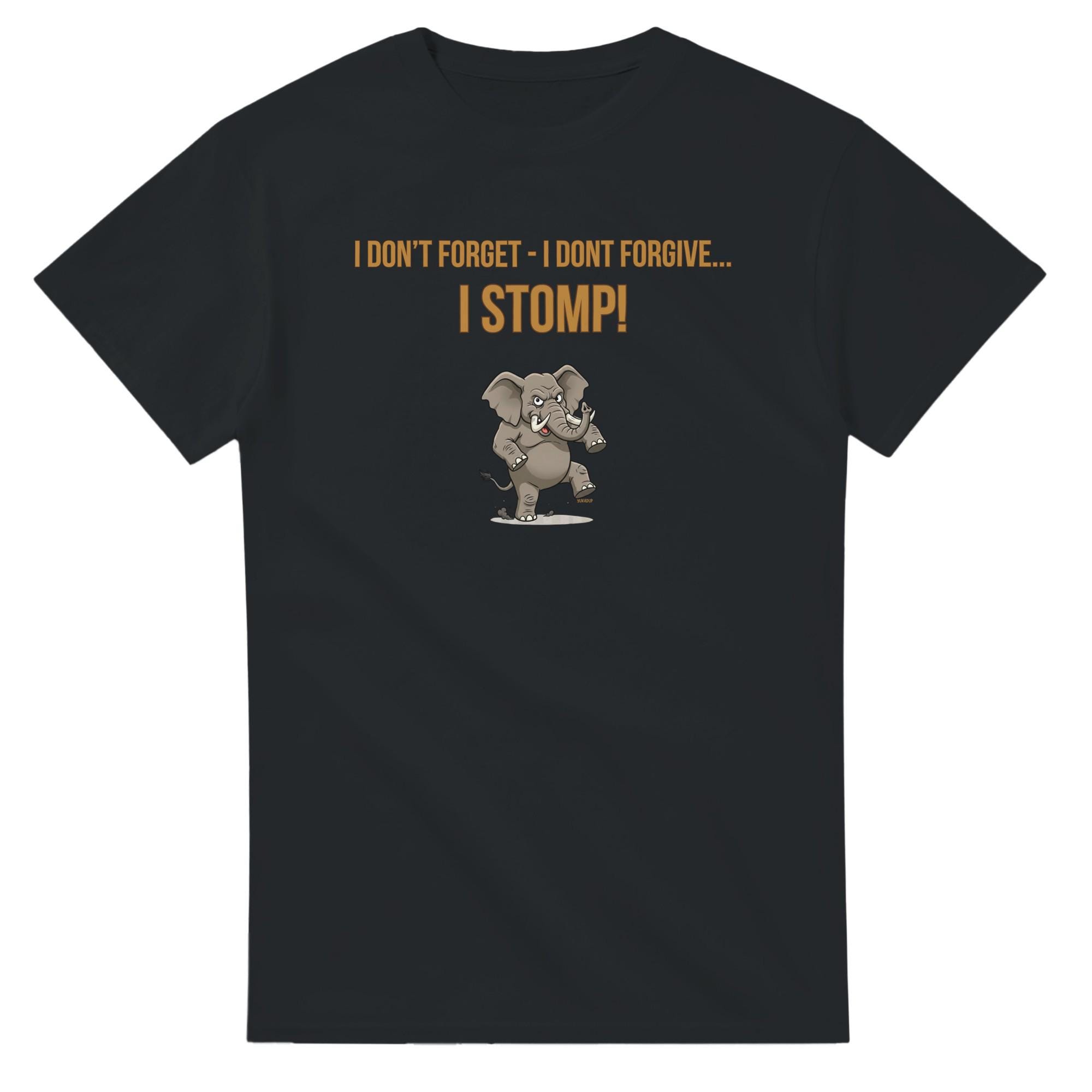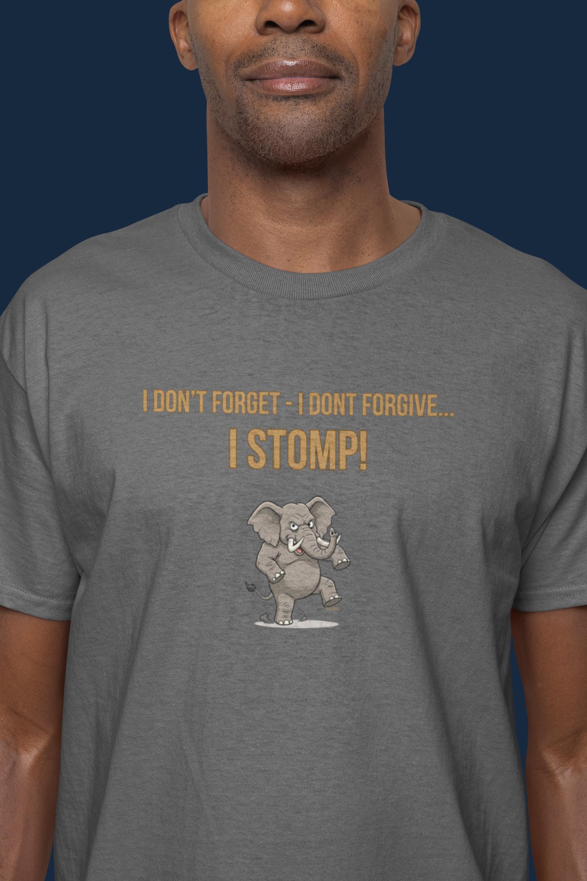 www.etsy.com/shop/YukaDupUnleash your inner powerhouse with the "I DON'T FORGET - I DON'T FORGIVE - I STOMP" T-shirt. This design features a massive, determined elephant, legs braced and ready to stomp out any obstacle in its path. It’s a bold statement inspired by the elephant’s legendary memory and fierce protective nature.