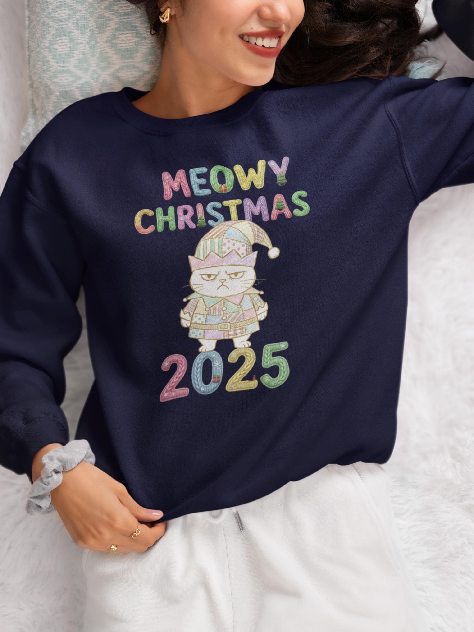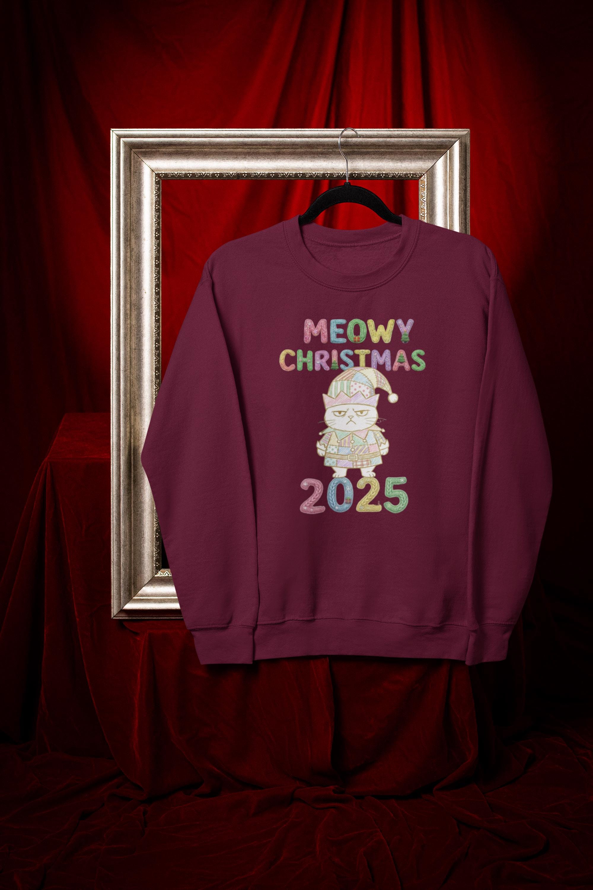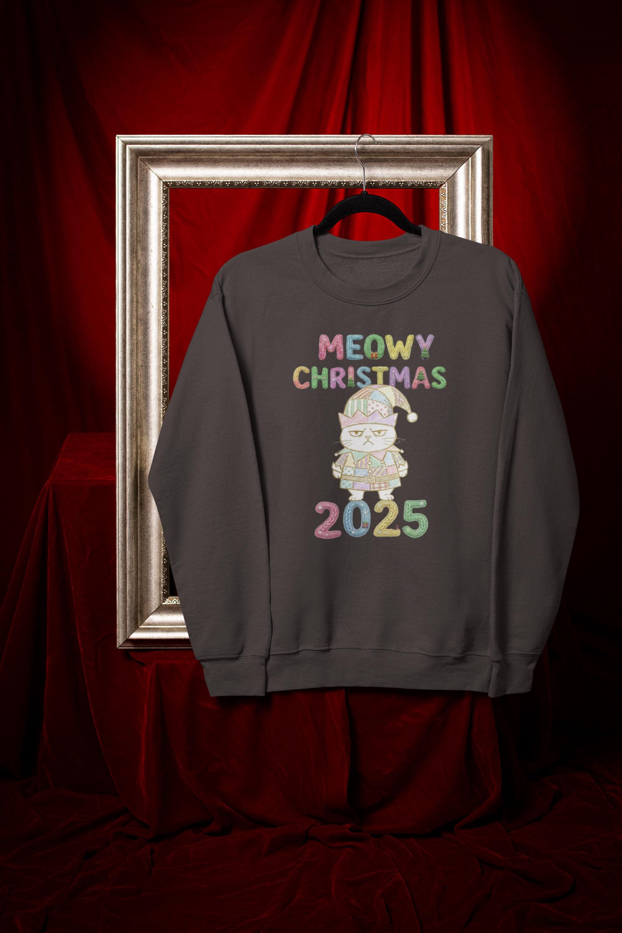 Snuggle up and get ready to smile! This wonderfully soft, comfortable, print sweatshirt is the ideal holiday wear. The design features a fantastic, frowning feline paired with the fun slogan MEOWY CHRISTMAS 2025, creating a funny contrast that brightens any holiday gathering. A great gift for yourself or the cat lover in your life!