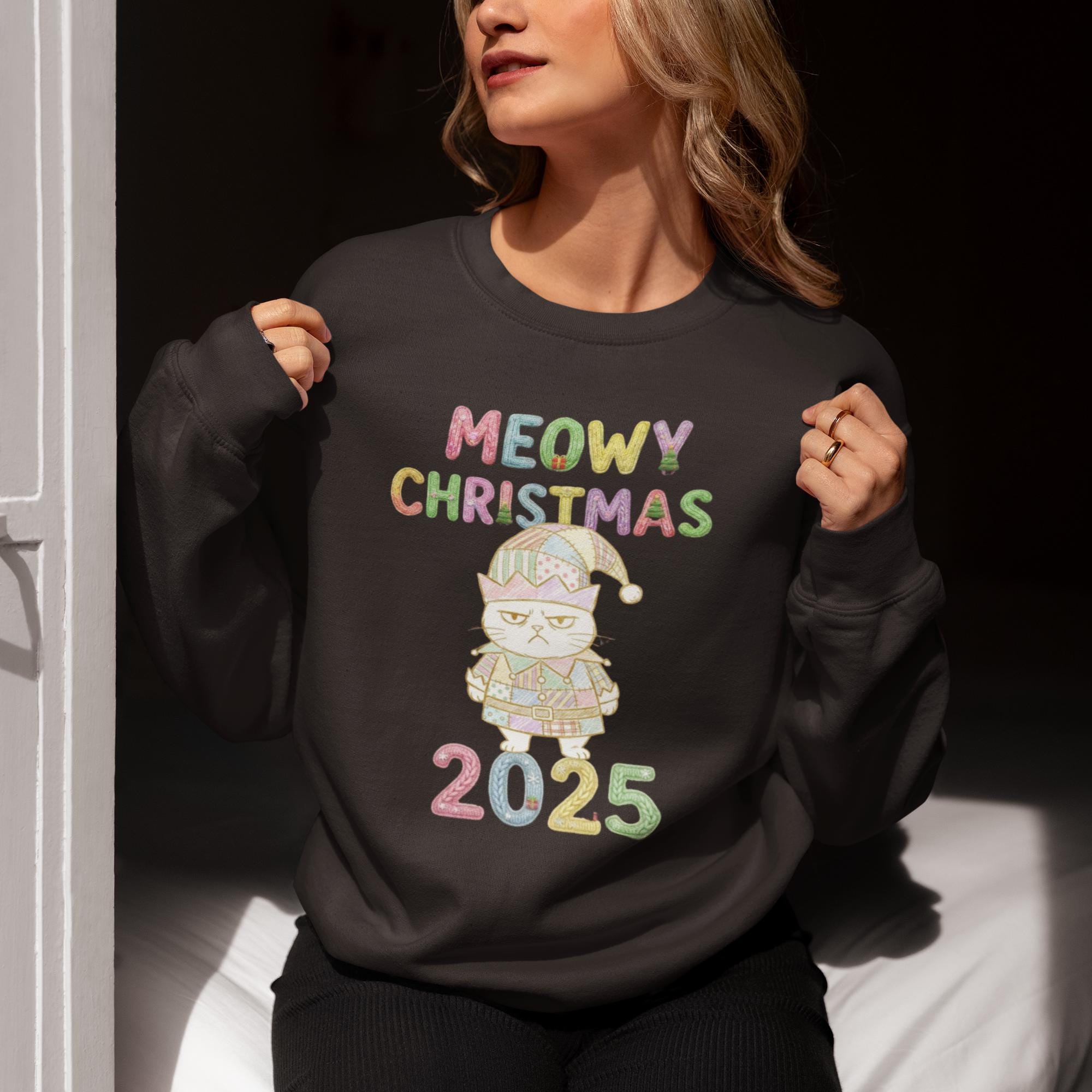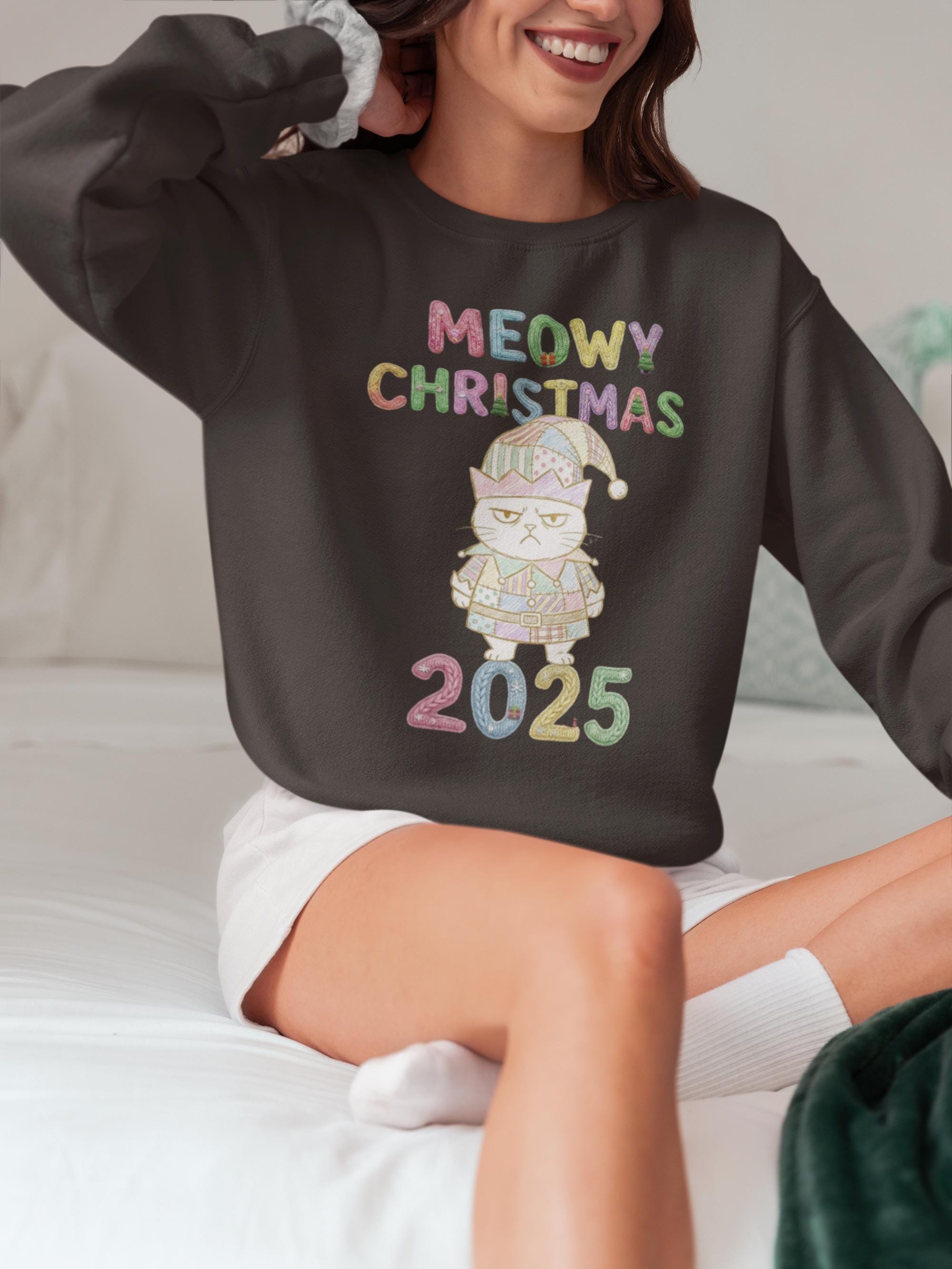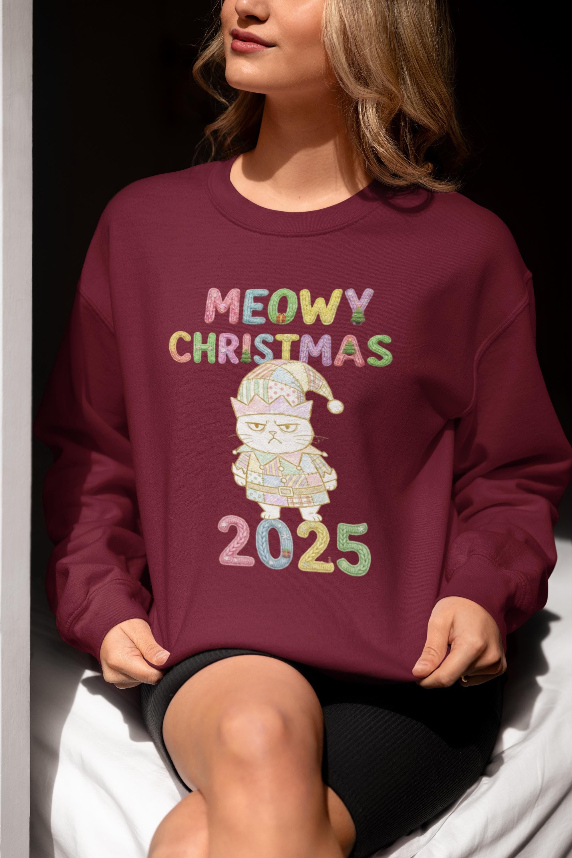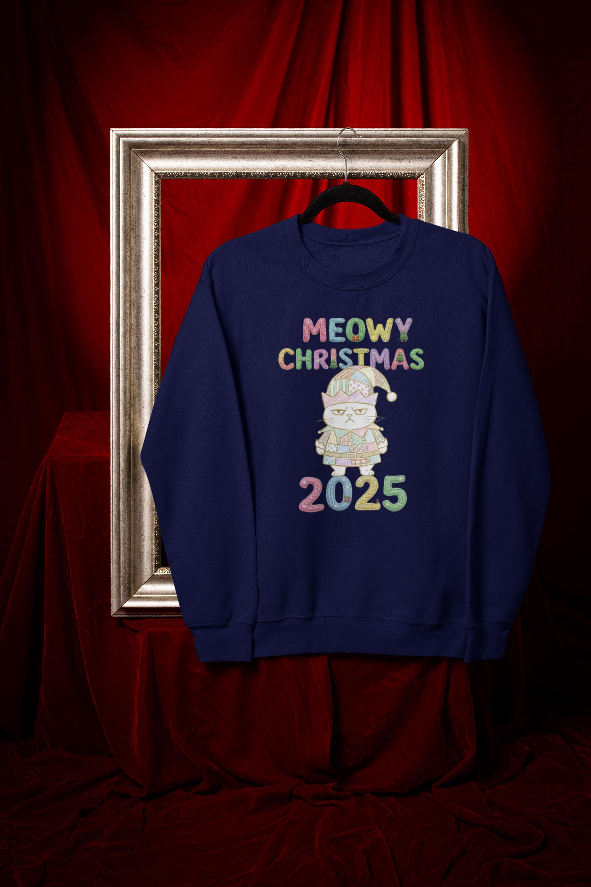 Snuggle up and get ready to smile! This wonderfully soft, comfortable, print sweatshirt is the ideal holiday wear. The design features a fantastic, frowning feline paired with the fun slogan MEOWY CHRISTMAS 2025, creating a funny contrast that brightens any holiday gathering. A great gift for yourself or the cat lover in your life!