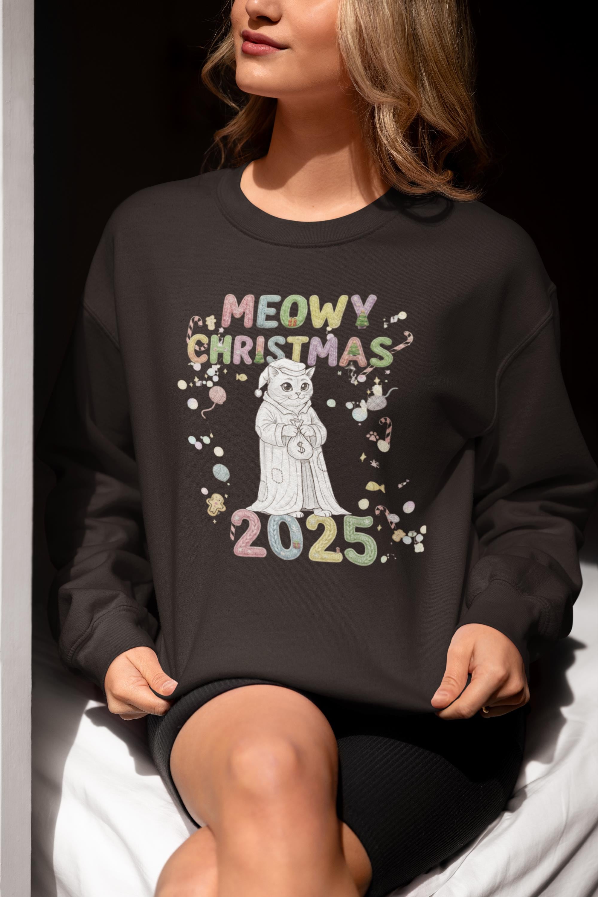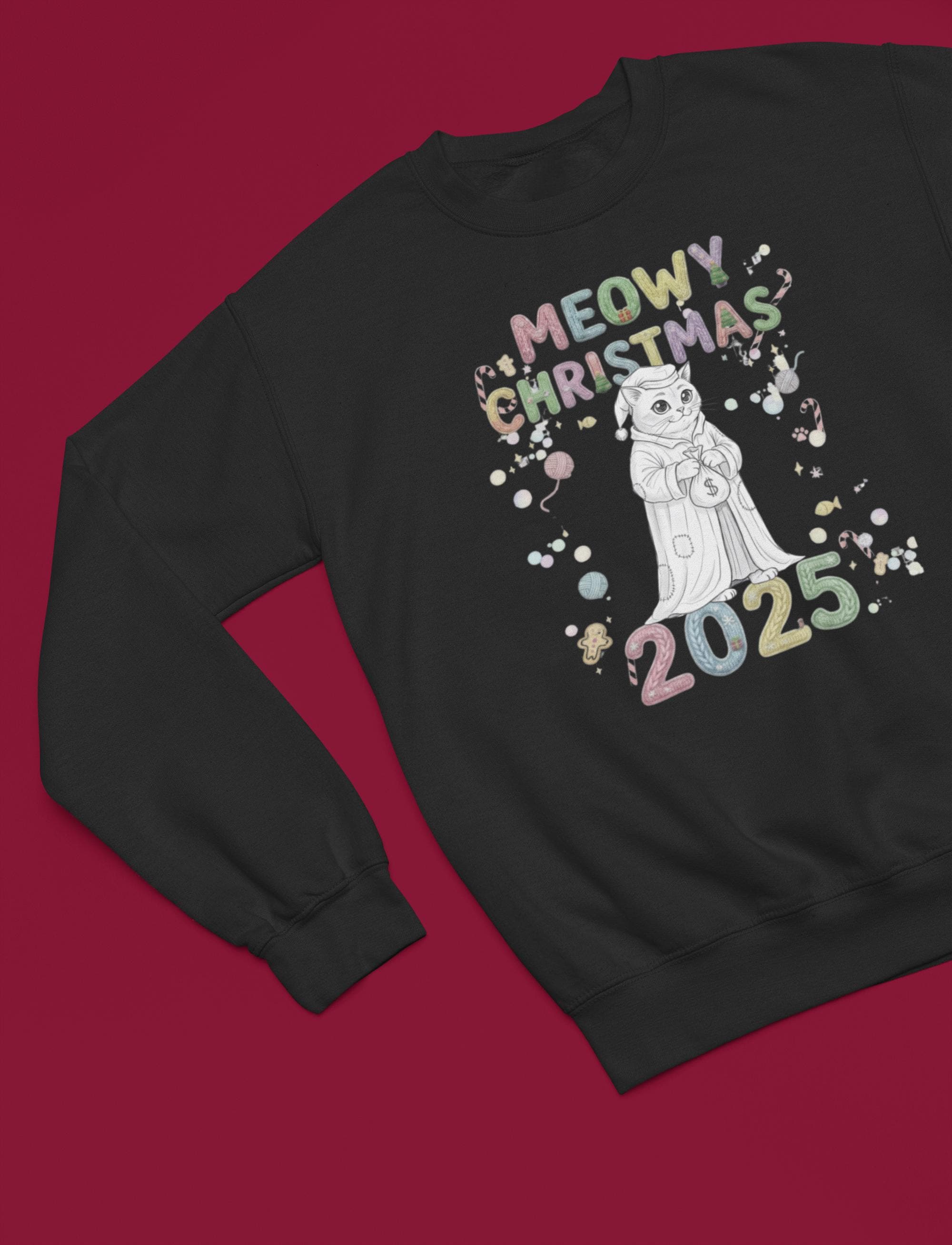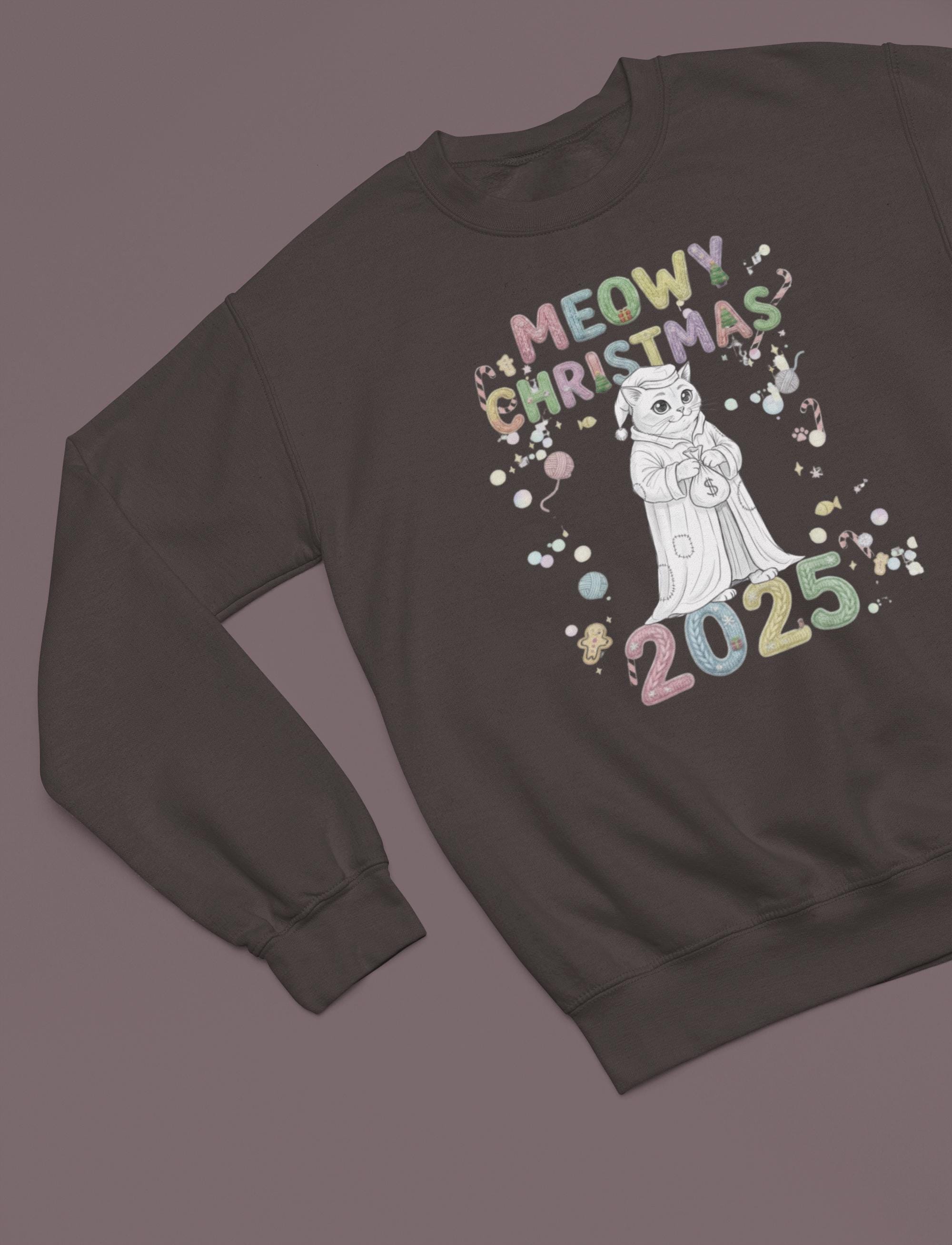 Snuggle up and get ready to smile! This wonderfully soft, comfortable, print sweatshirt is the ideal holiday wear. The design features a fantastic, frowning feline paired with the fun slogan MEOWY CHRISTMAS 2025, creating a funny contrast that brightens any holiday gathering. A great gift for yourself or the cat lover in your life!