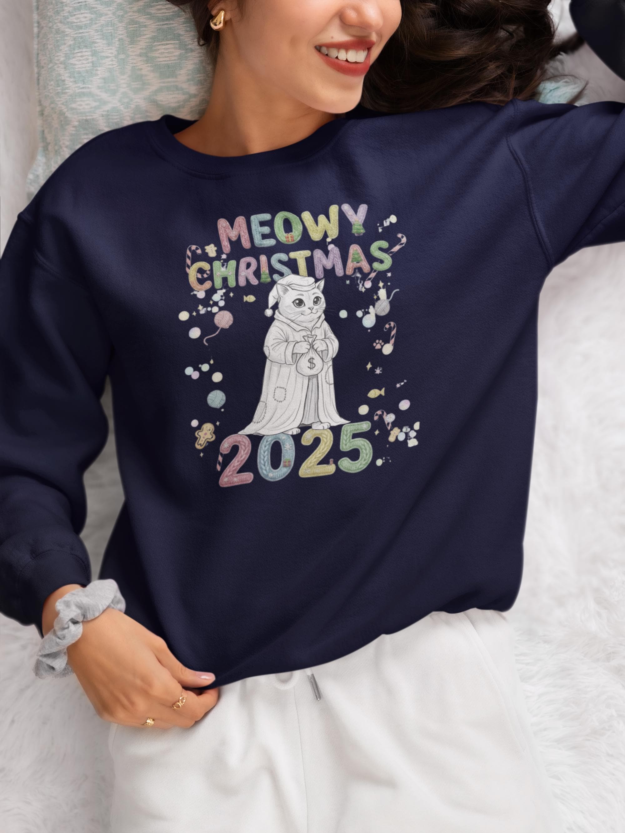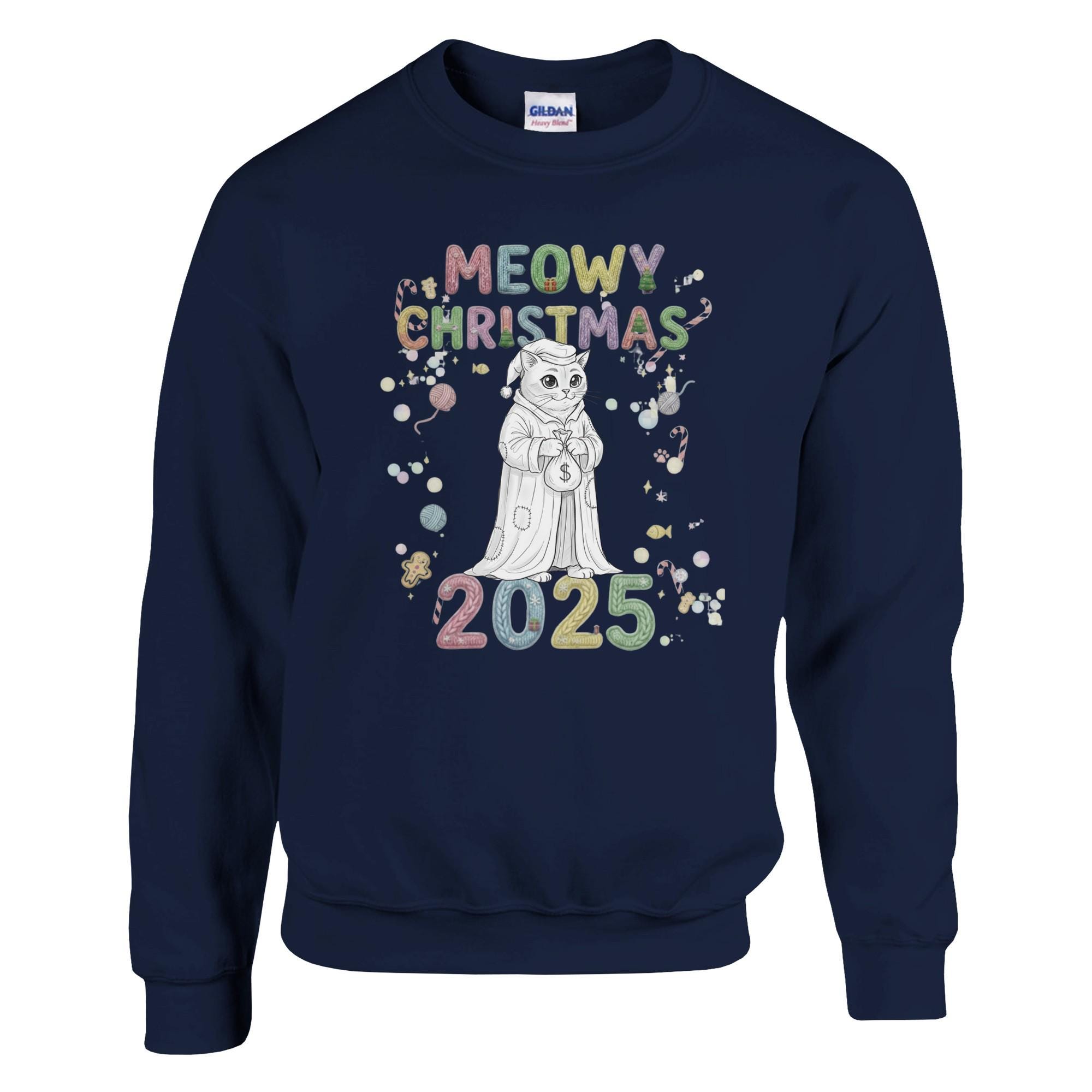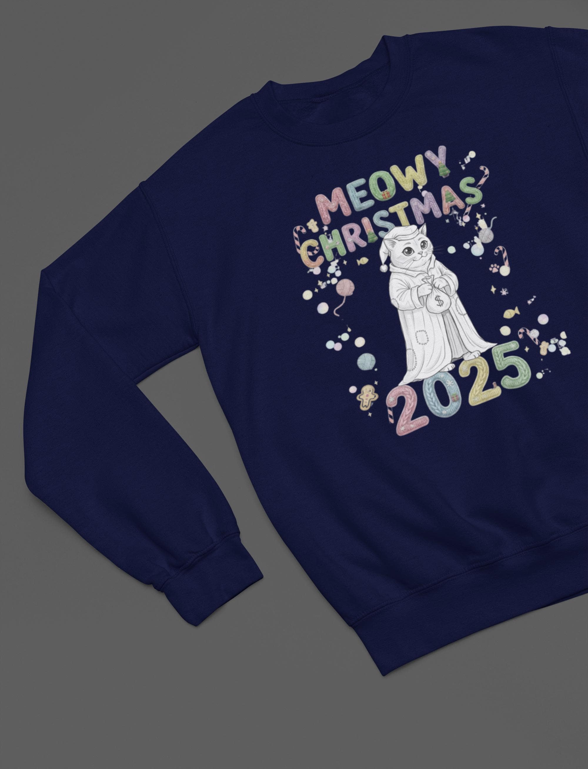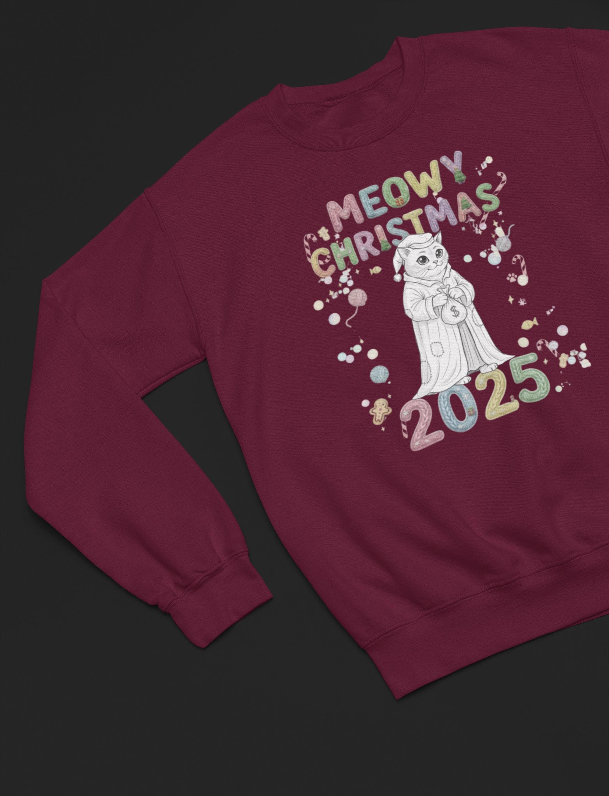 Snuggle up and get ready to smile! This wonderfully soft, comfortable, print sweatshirt is the ideal holiday wear. The design features a fantastic, frowning feline paired with the fun slogan MEOWY CHRISTMAS 2025, creating a funny contrast that brightens any holiday gathering. A great gift for yourself or the cat lover in your life!