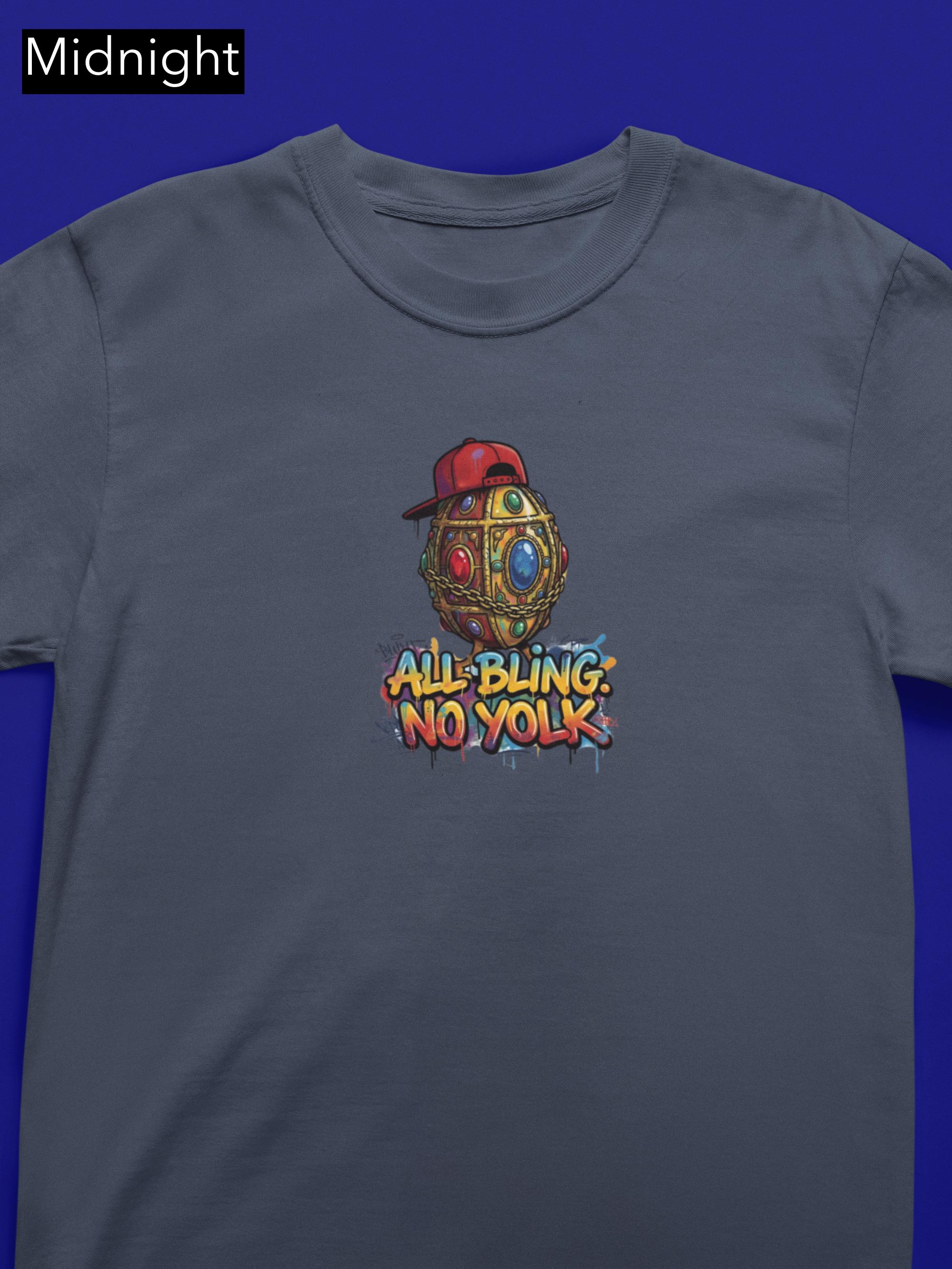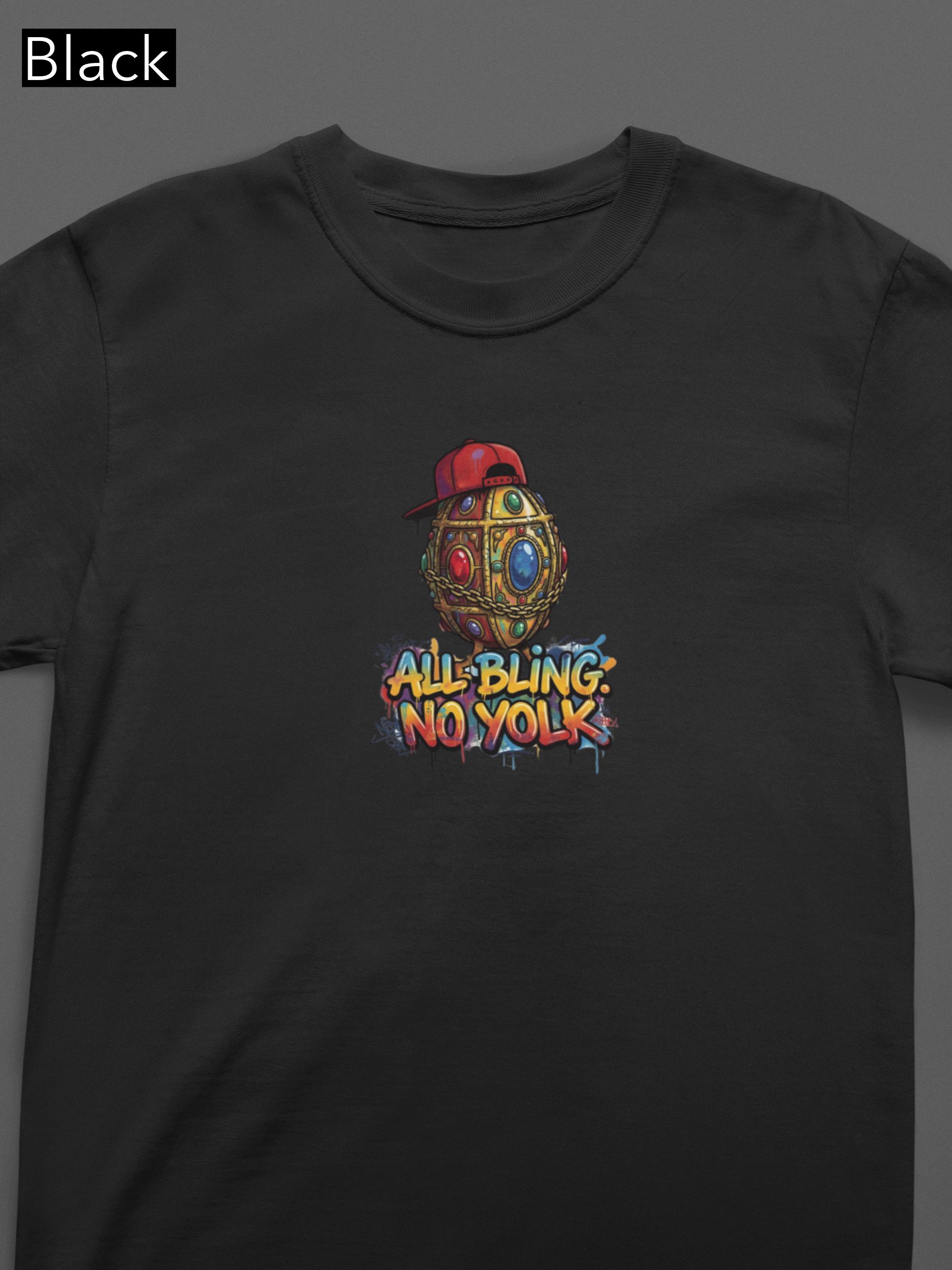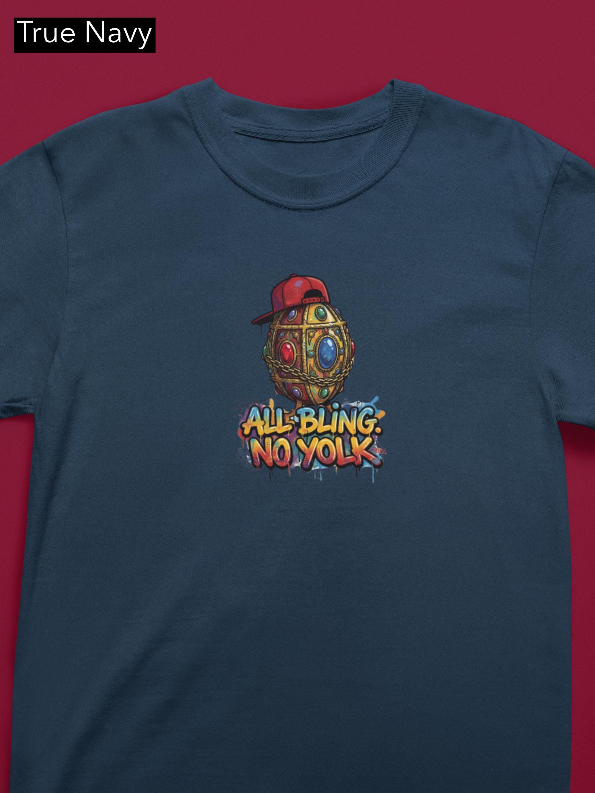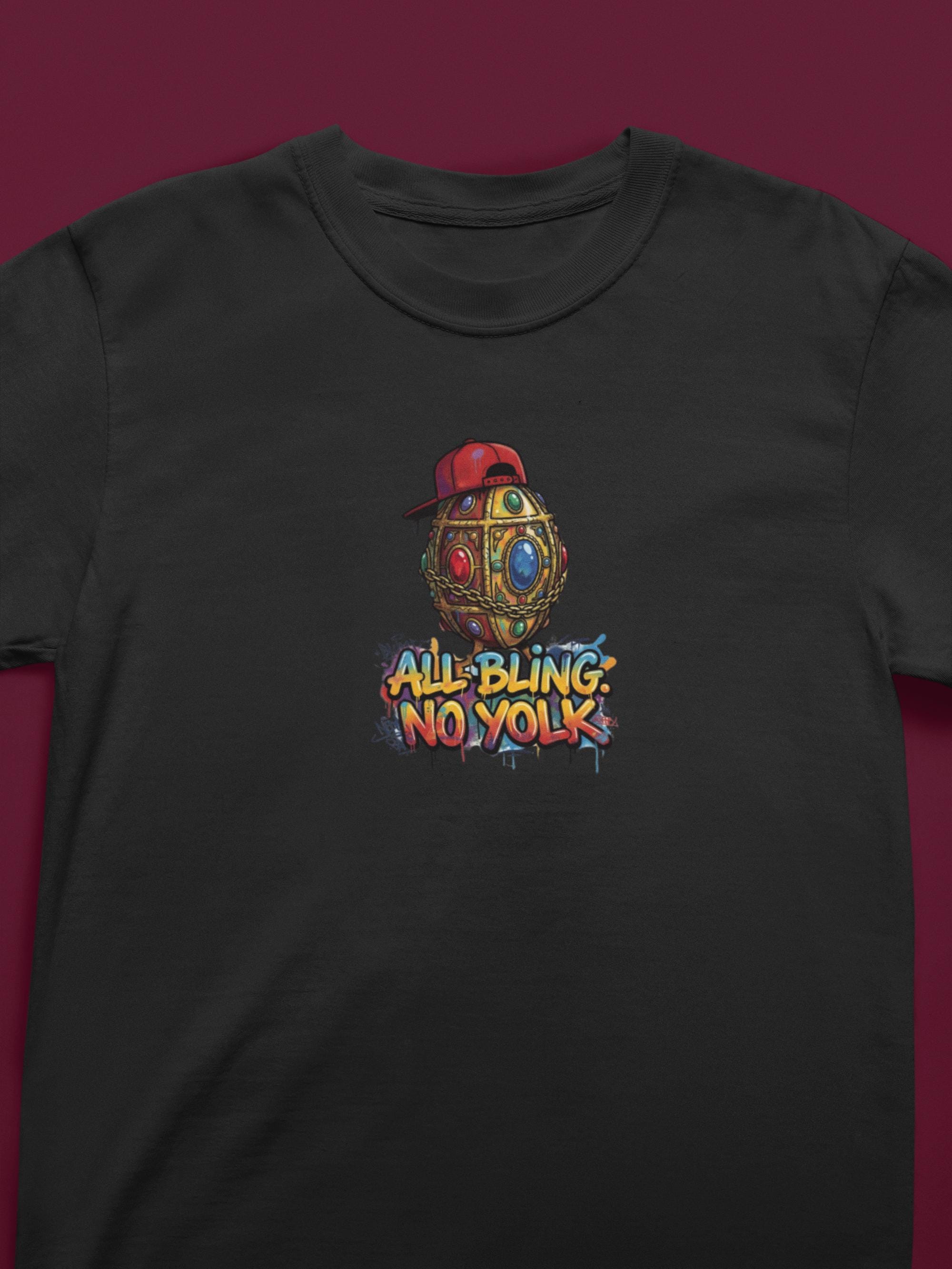Featuring a strutting Fabergé egg decked out in a heavy gold chain, this tee captures the ultimate "fake it 'til you make it" vibe. The slogan "All Bling. No Yolk" says it all: it might be hollow on the inside, but on the outside? it's pure gold.