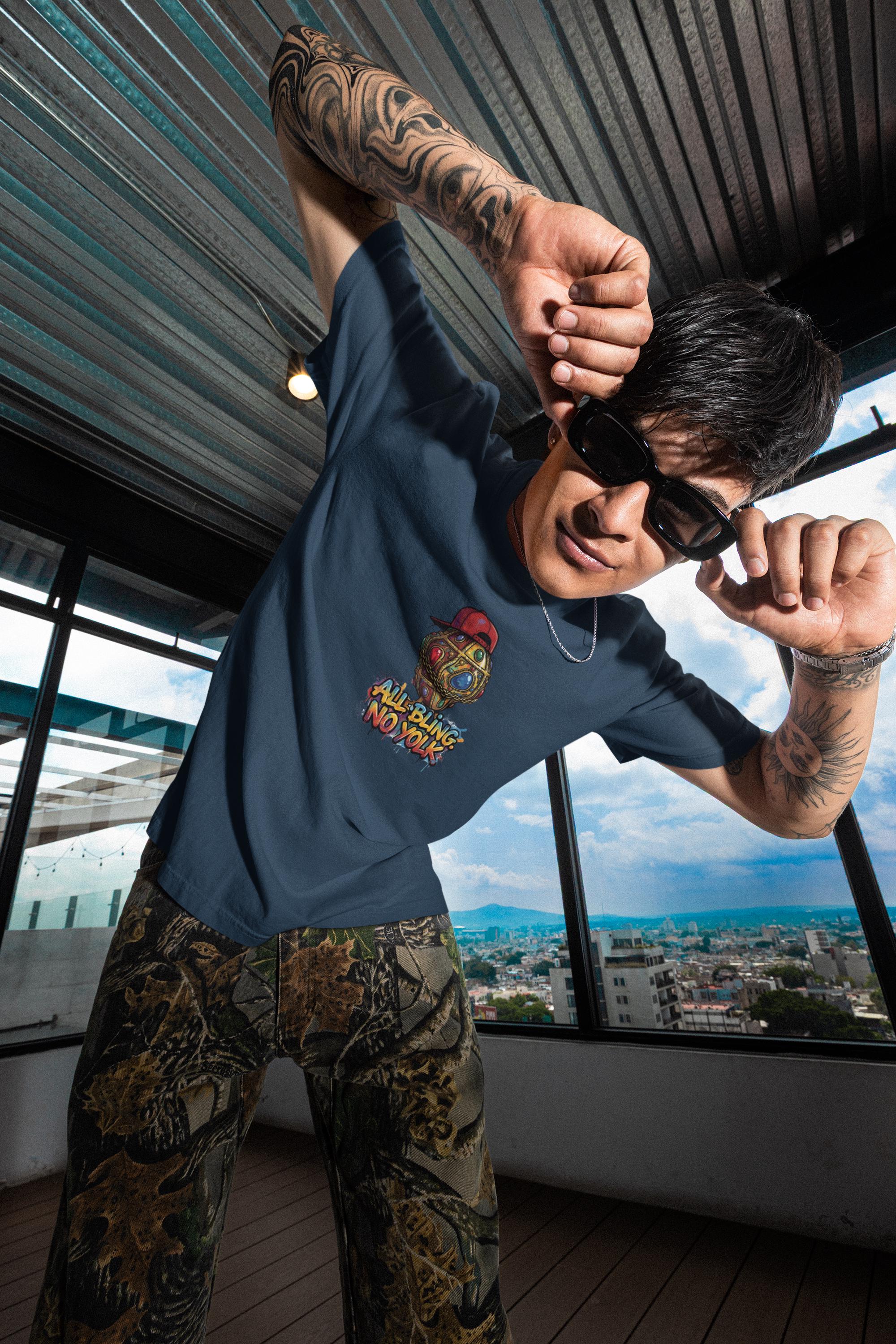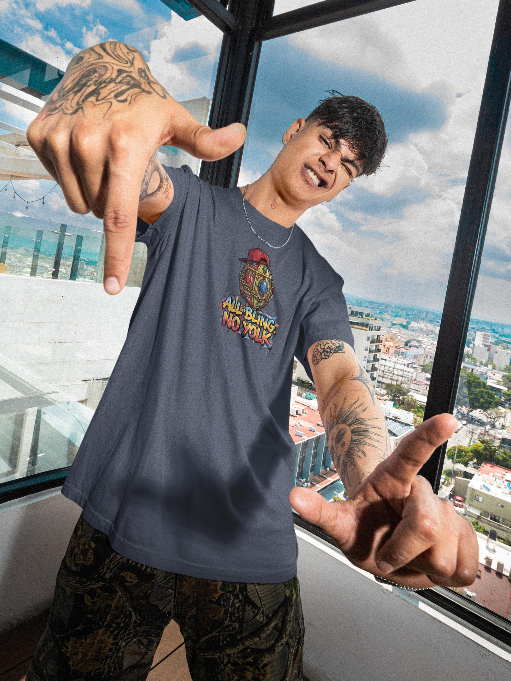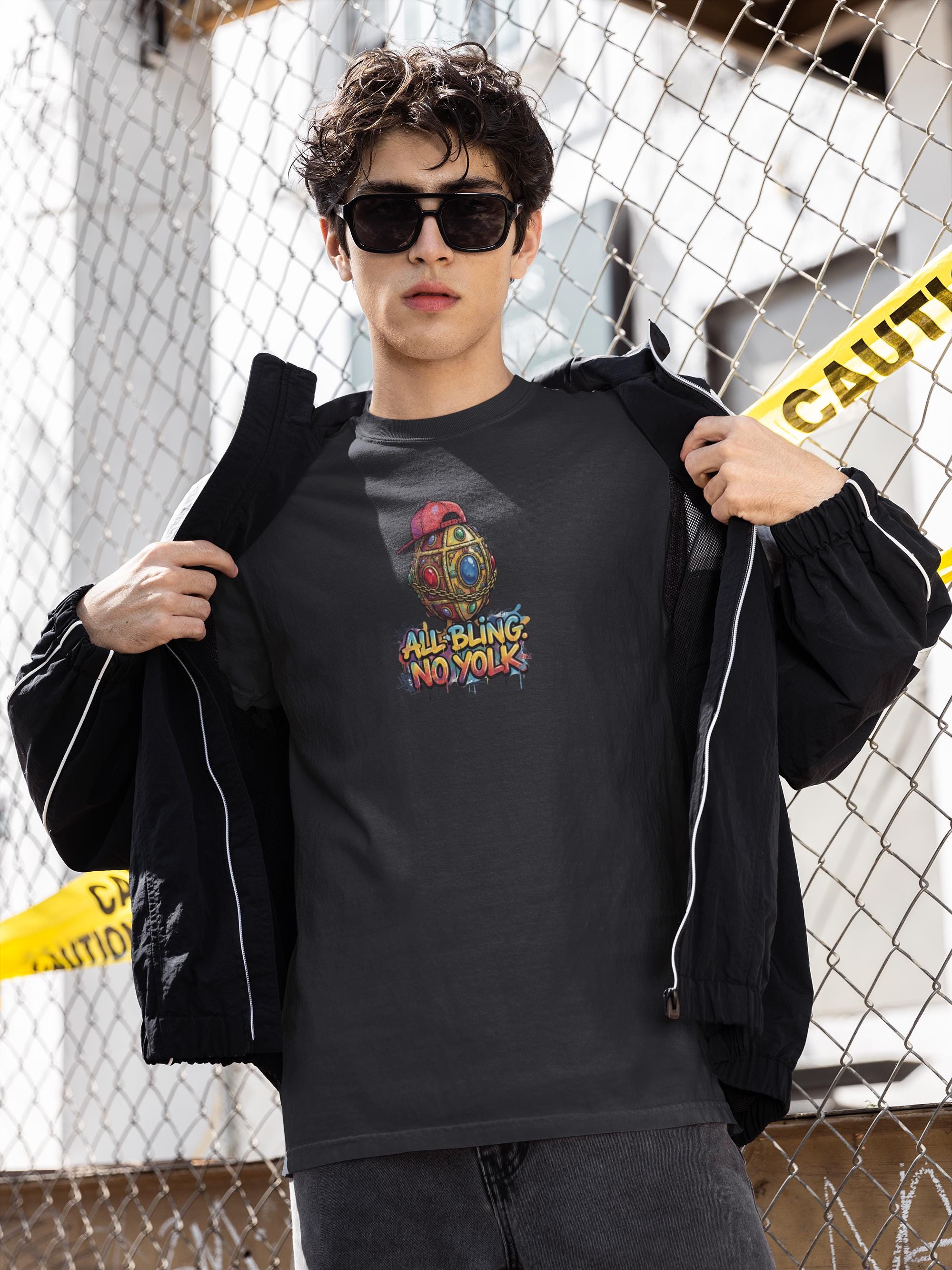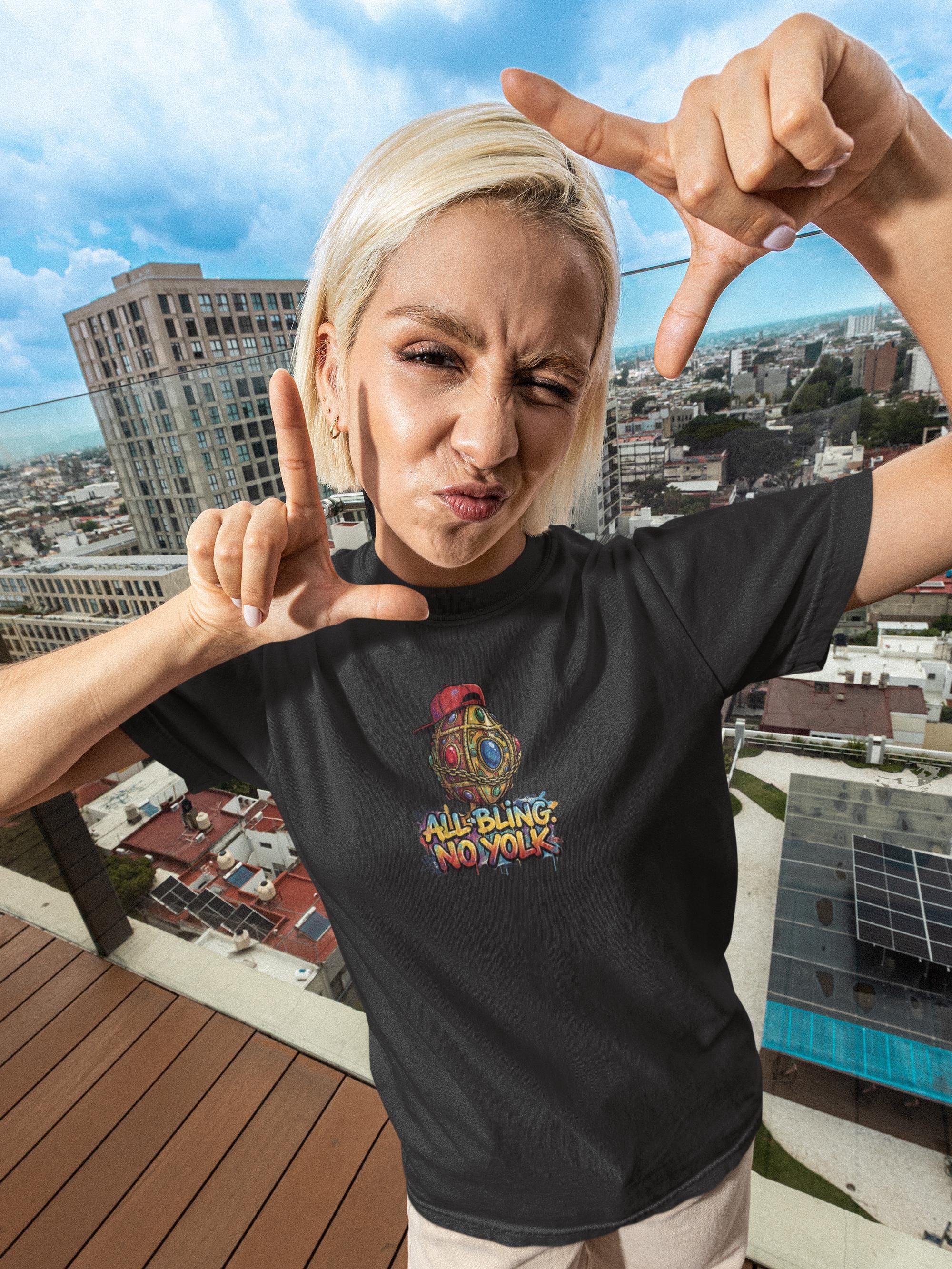 Featuring a strutting Fabergé egg decked out in a heavy gold chain, this tee captures the ultimate "fake it 'til you make it" vibe. The slogan "All Bling. No Yolk" says it all: it might be hollow on the inside, but on the outside? it's pure gold.