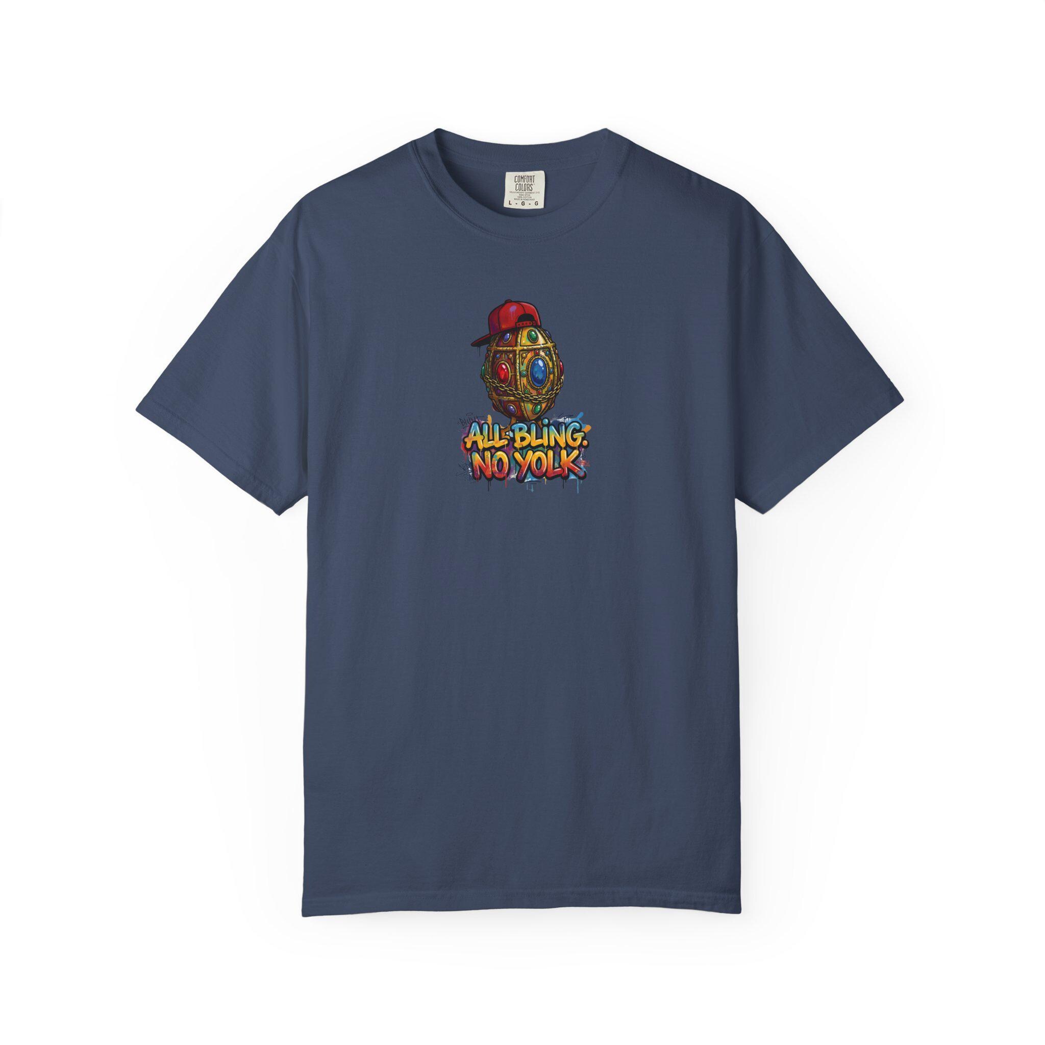 Soft, lived-in tee with a touch of quiet humor. This garment-dyed cotton shirt feels like one you’ve owned for years the moment you put it on — slightly worn-in, relaxed through the shoulders, and breathable for everyday wear. A small, hand-drawn-style Faberge egg illustration and the understated line “ALL BLING, NO YOLK” sit on the chest, adding a playful, low-key statement without shouting. Wear it with worn denim for lazy weekends, layered under a flannel for mornings at the farmer’s market, or tossed into a travel bag for easy packing. The neutral canvas keeps focus on the clever design and makes it a subtle conversation starter among fellow food-lovers and casual style fans.