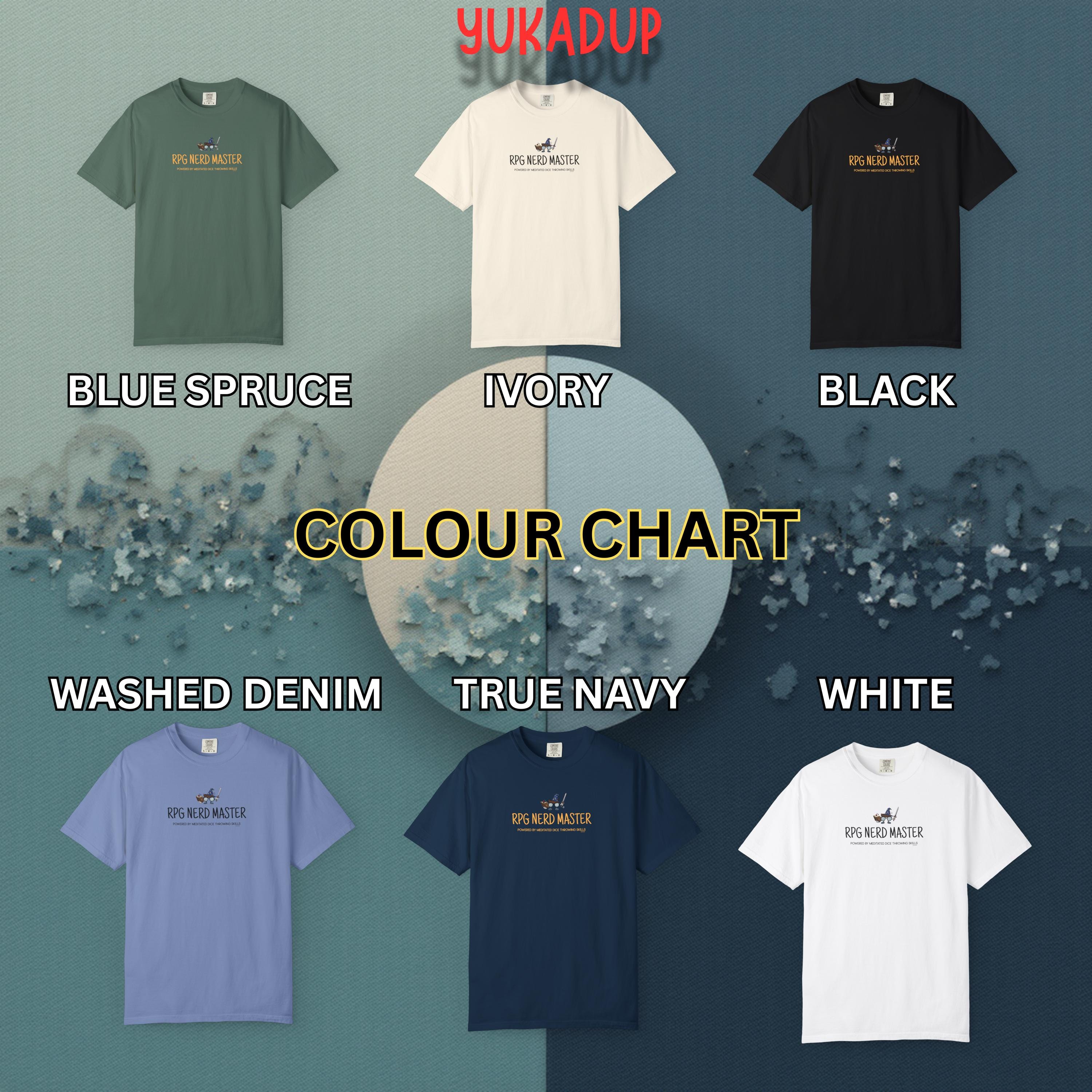 This tee speaks directly to the late-night campaigners and dice-clutching strategists. Soft, garment-dyed cotton wears in like a familiar tavern cloak, the bold "RPG MASTER NERD" slogan and cheeky line about "Meditated Dice Throwing Skills" start conversations at gaming tables and local meetups. It sits loose and comfortable after long sessions—easy to roll a Nat 20 in or settle into for a rulebook deep dive. The design feels like a nod from one player to another: a little proud, a little amused, and entirely at home among board games, RPG nights, conventions, and cosy hobby sessions.