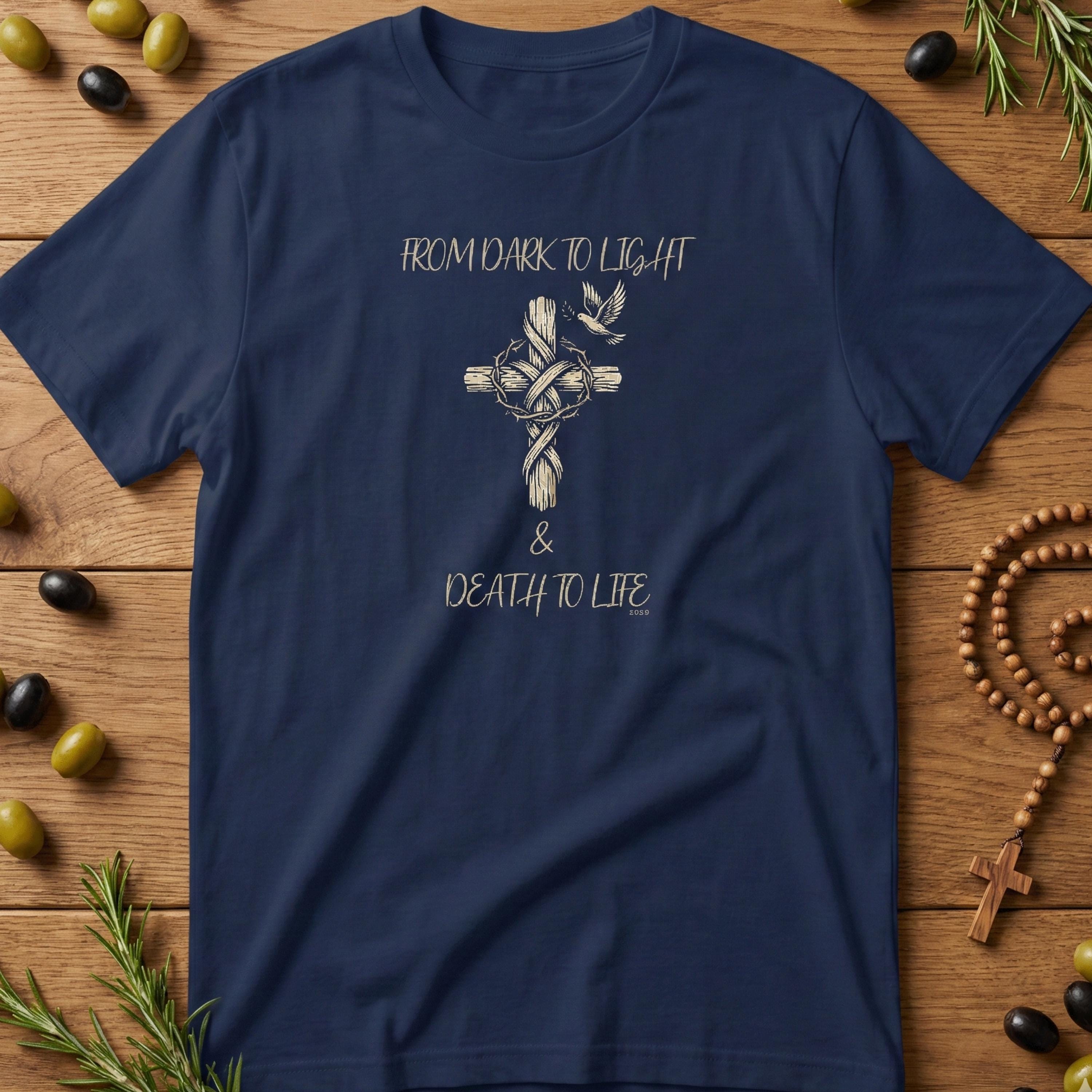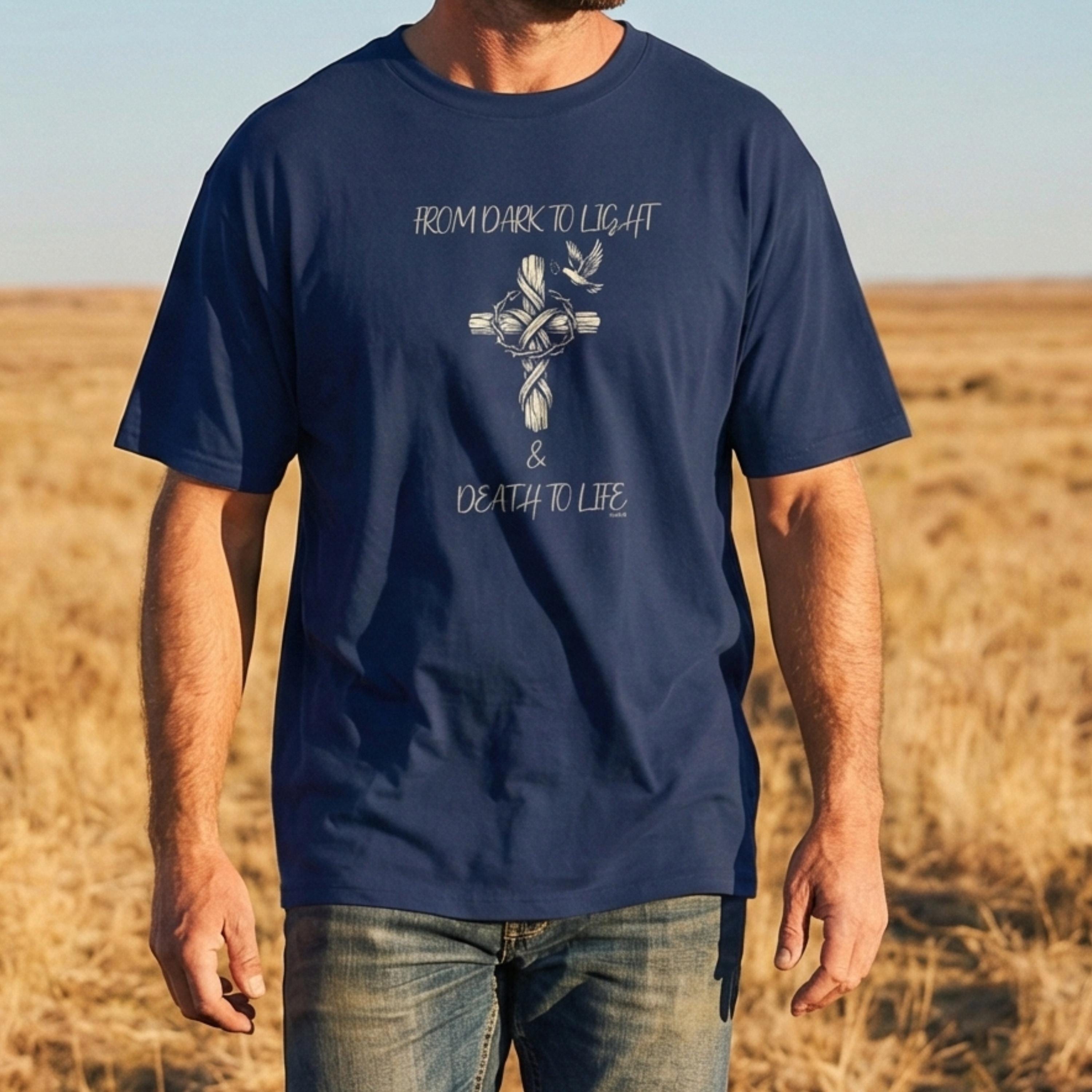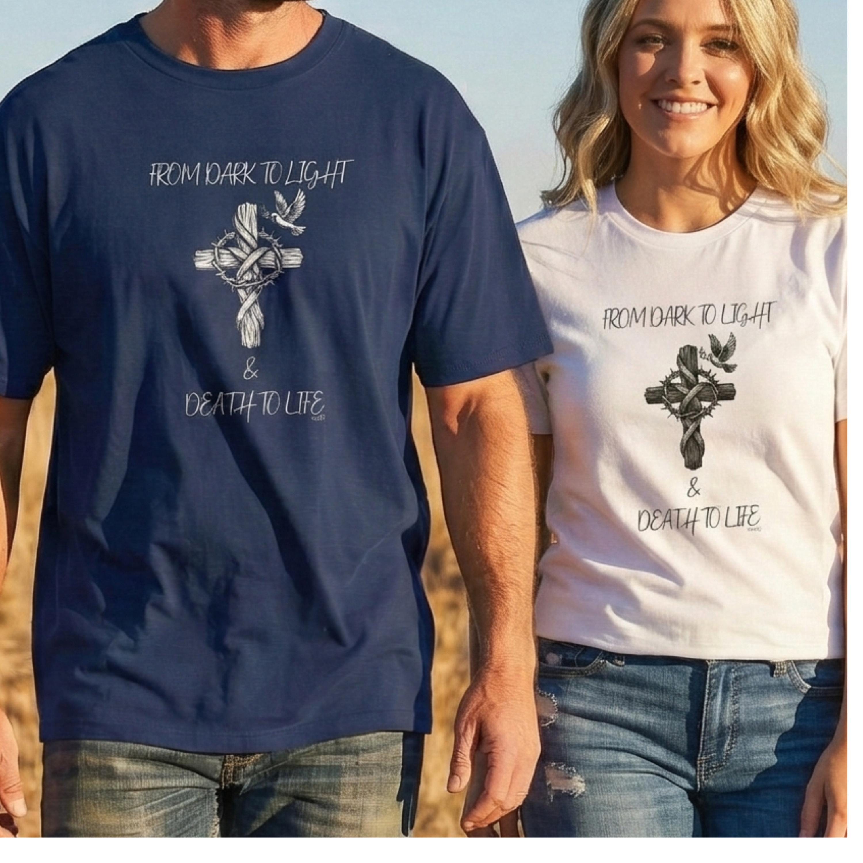 Embrace your faith in style with our unisex t-shirt from YukaDUP's new faith line! This trendy oversized tee showcases a powerful slogan, 'From Dark To Light & Death To Life,' elegantly paired with a graphic of a cross, making it an ideal choice for anyone who holds their beliefs close to their heart.